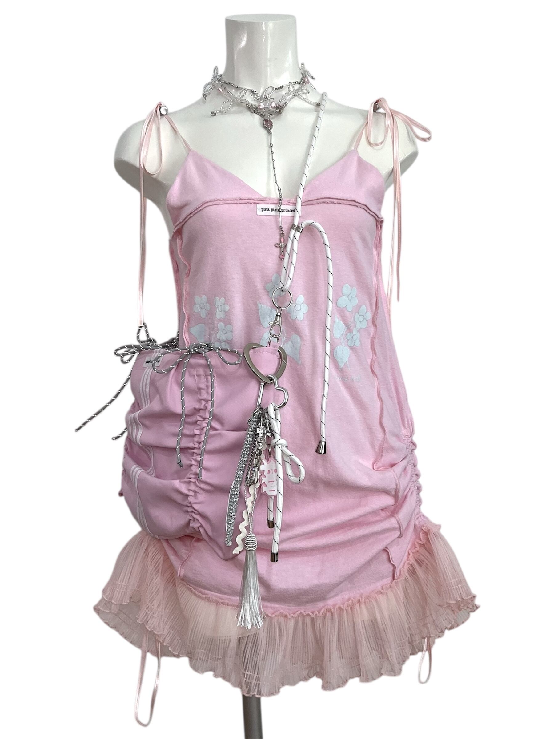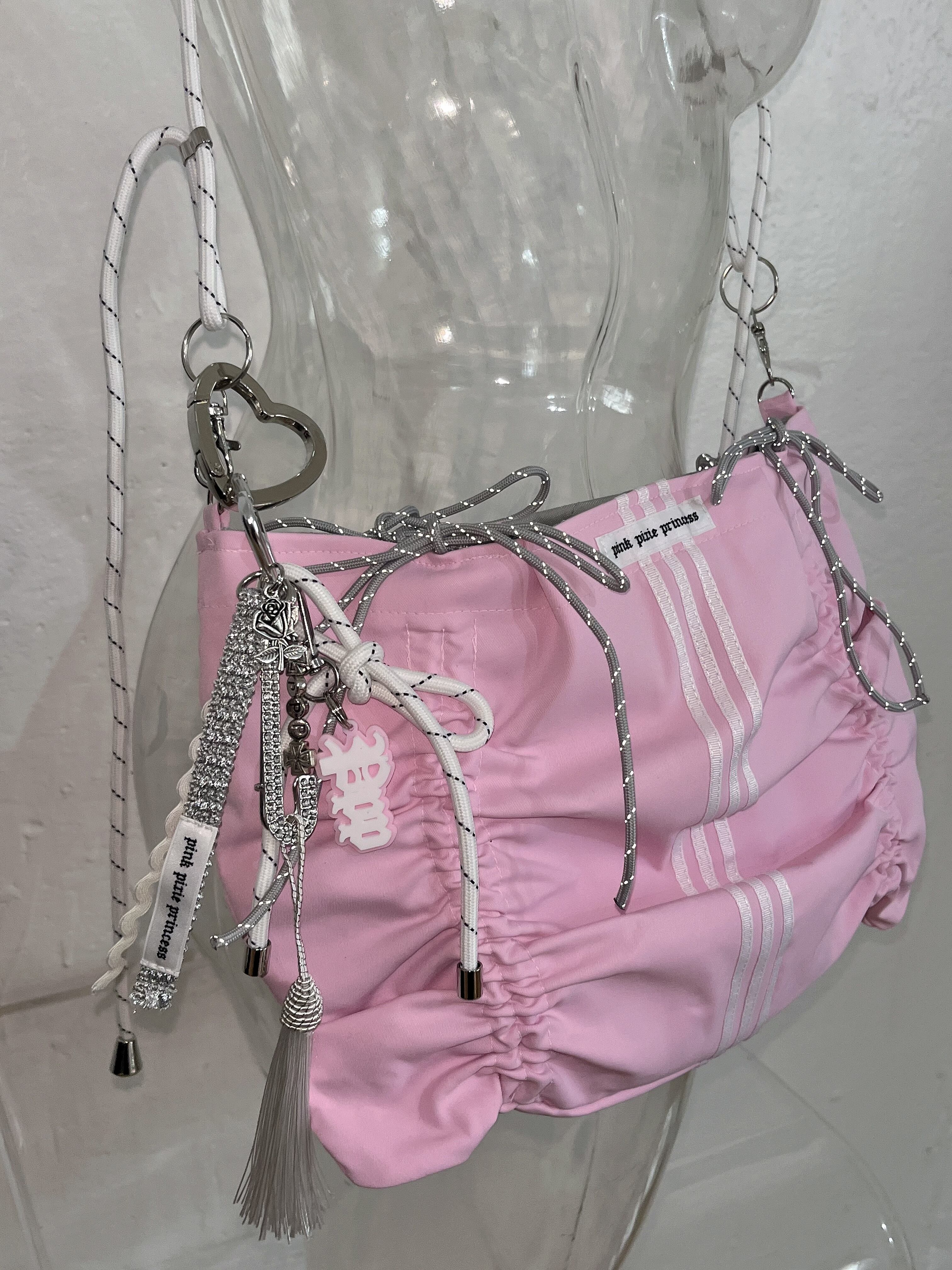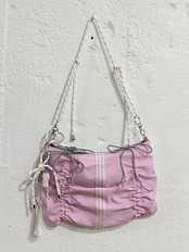 こちらはトラックスーツを解体し、一部生地を再利用して制作したギャザーリボンハンドバッグです。