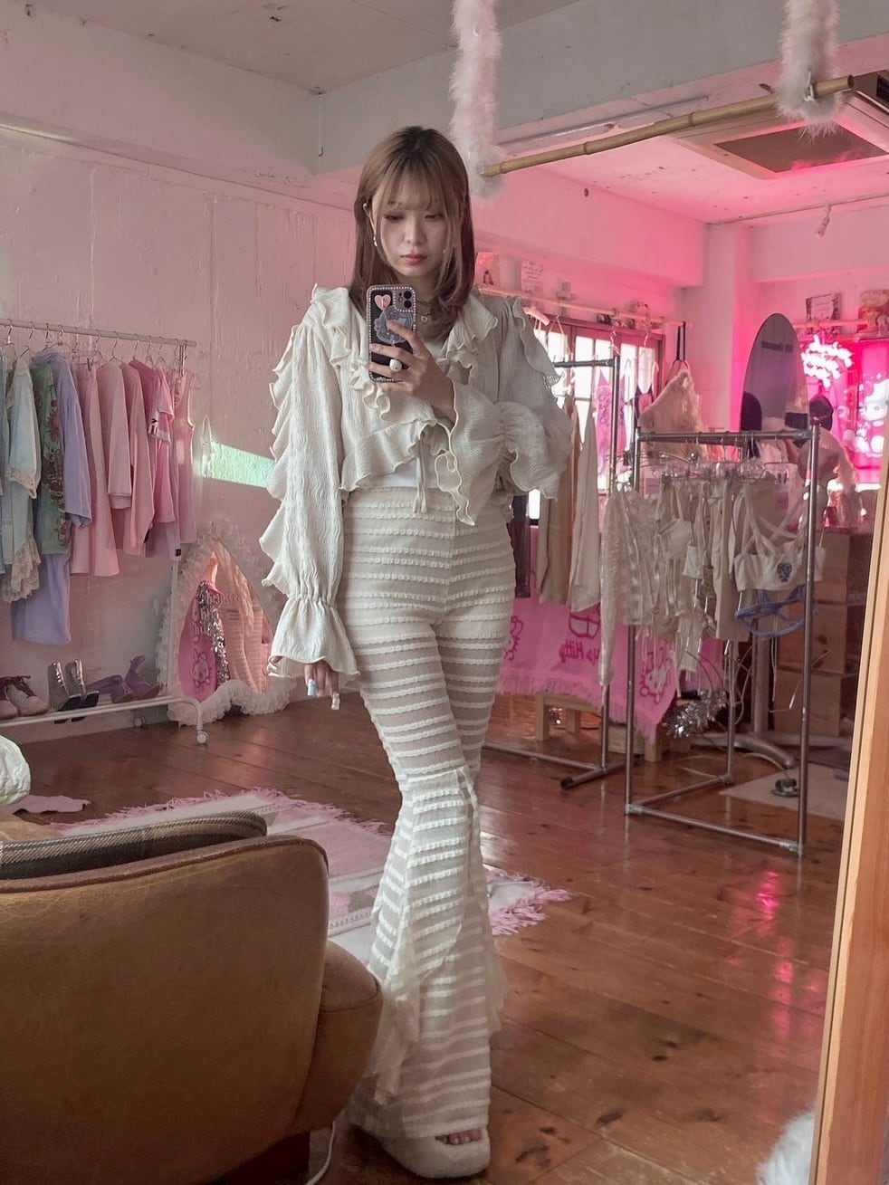 歩くたびにゆらゆら揺れるデザインがやわらかな女性らしさを演出します。