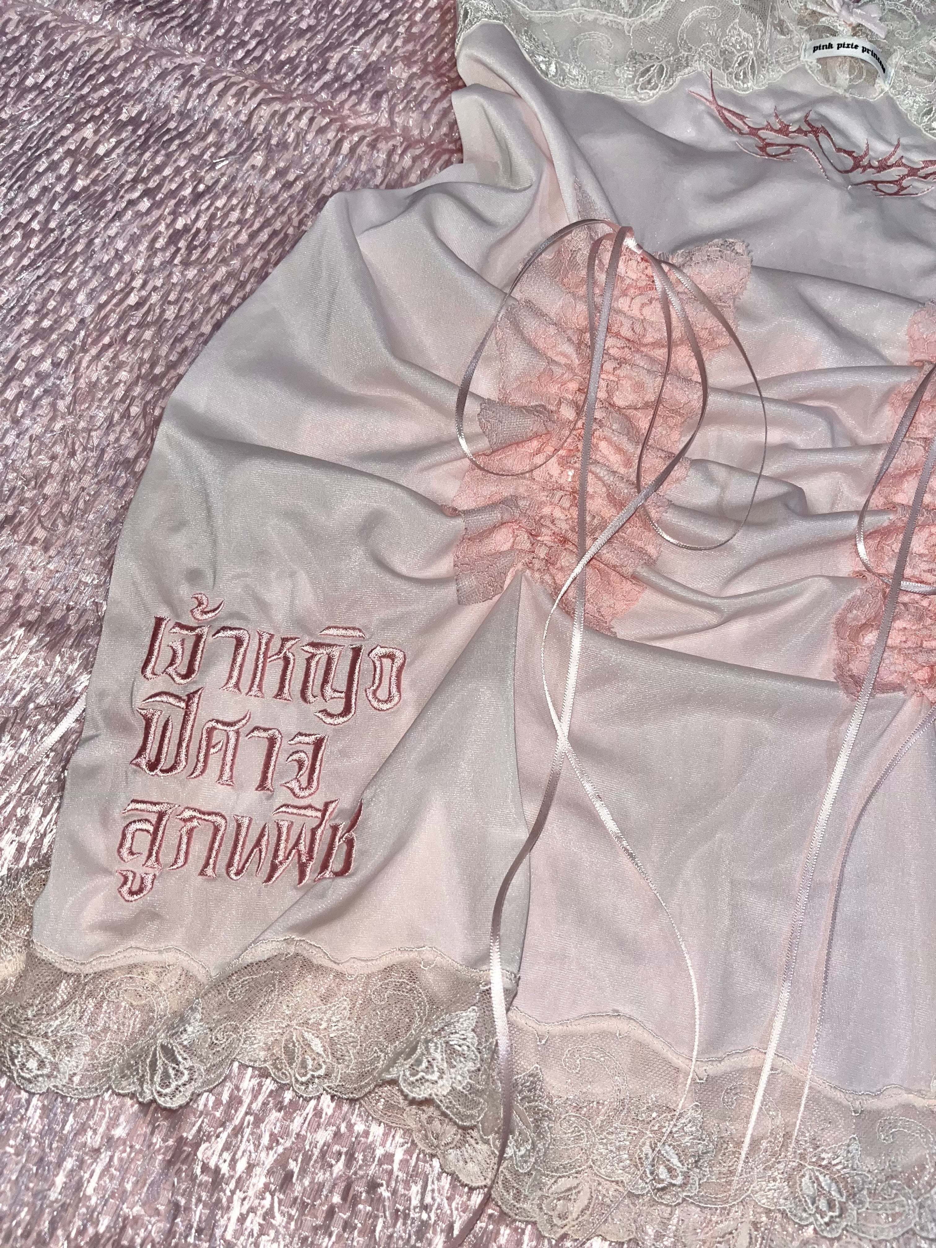桃妖姫(日本語)・เจ้าหญิง ปีศาจ ลูกพีช(タイ語)のロゴ刺繍を施した一点ものリメイクアイテム。