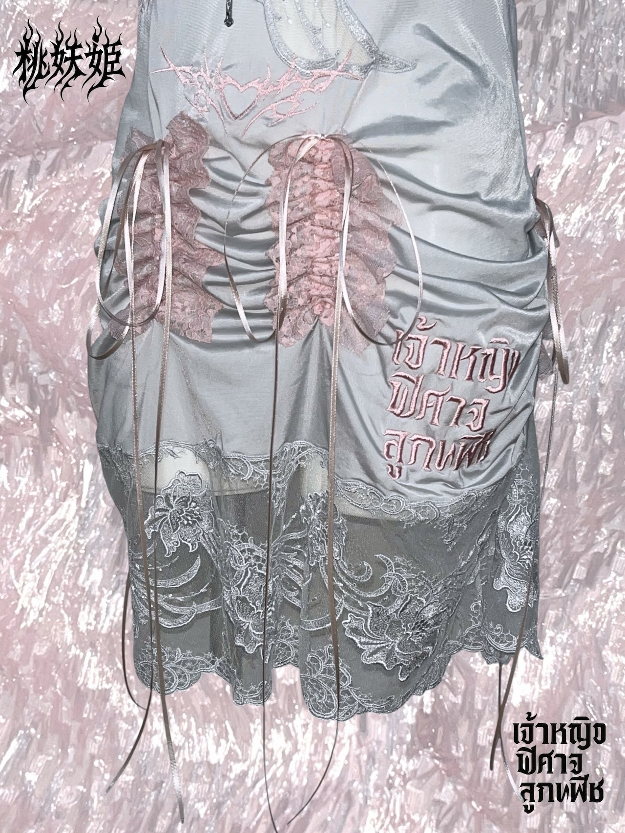 桃妖姫(日本語)・เจ้าหญิง ปีศาจ ลูกพีช(タイ語)のロゴ刺繍を施した一点ものリメイクアイテム。