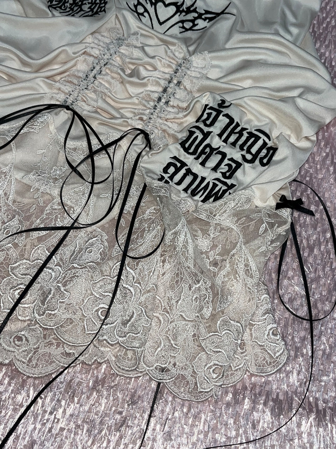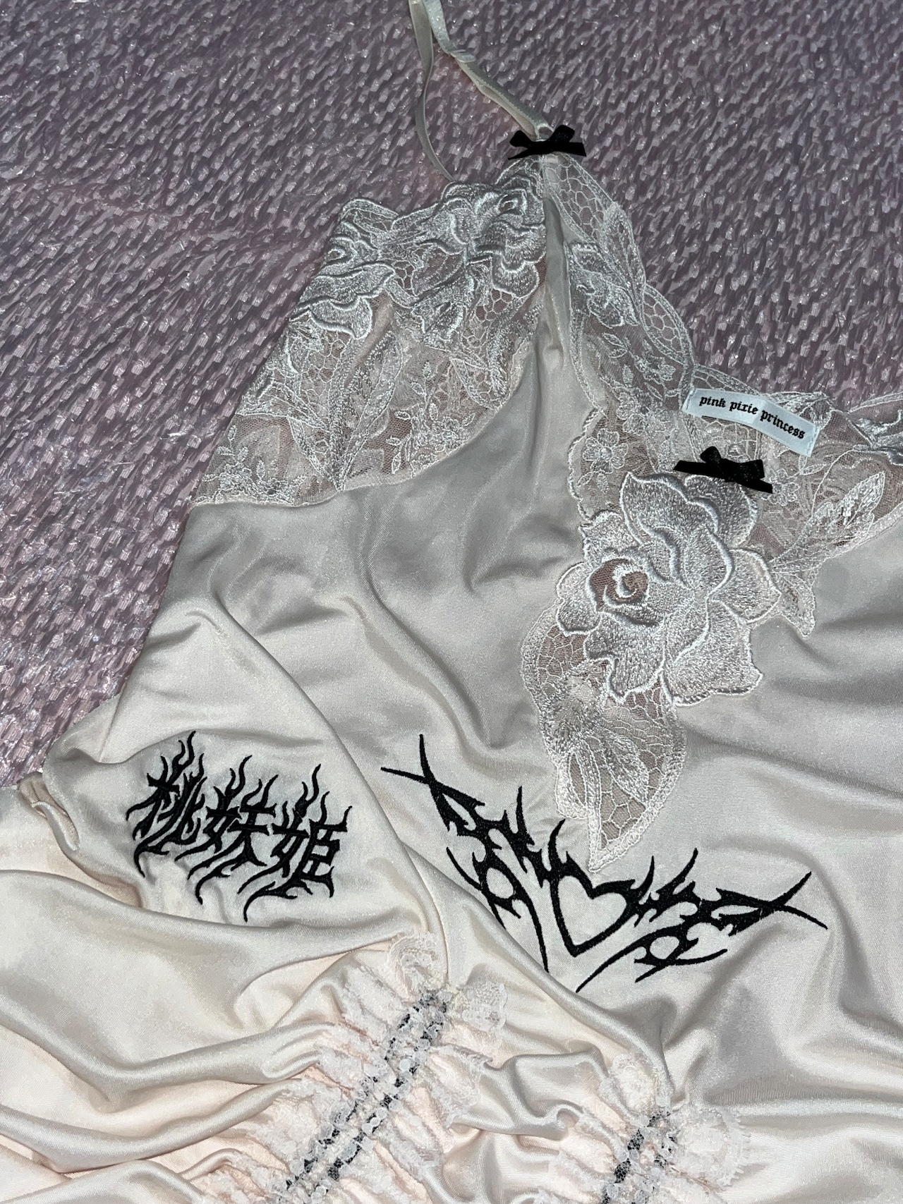 桃妖姫(日本語)・เจ้าหญิง ปีศาจ ลูกพีช(タイ語)のロゴ刺繍を施した一点ものリメイクアイテム。
