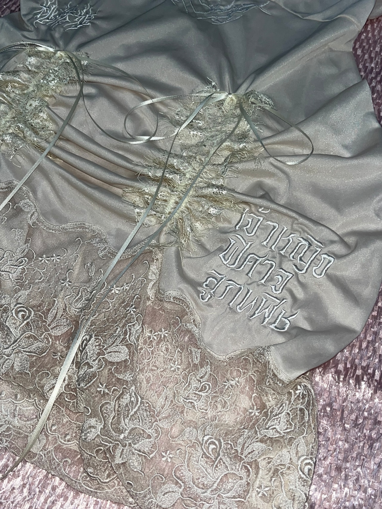 桃妖姫(日本語)・เจ้าหญิง ปีศาจ ลูกพีช(タイ語)のロゴ刺繍を施した一点ものリメイクアイテム。