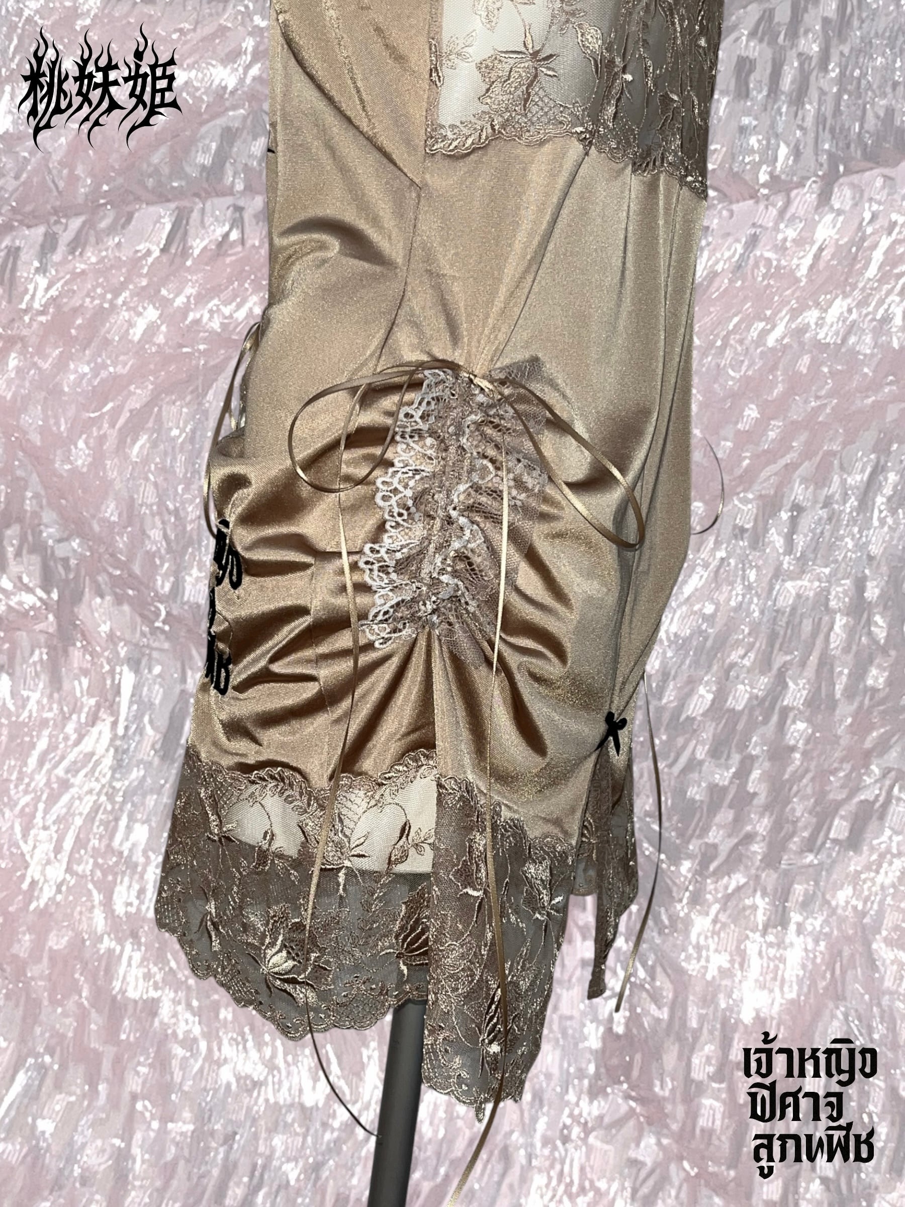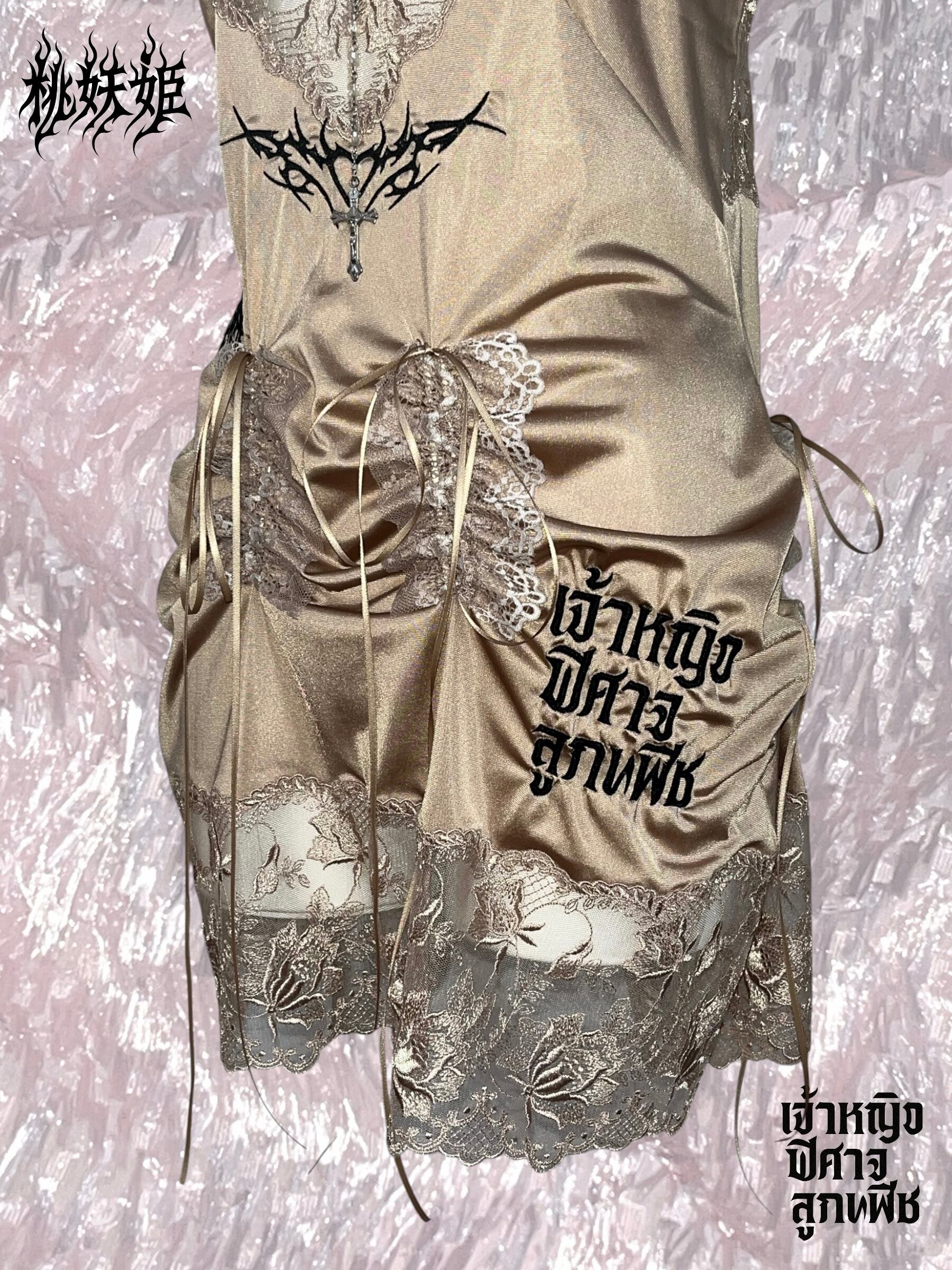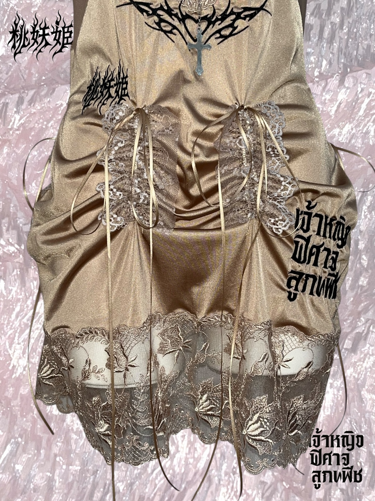 桃妖姫(日本語)・เจ้าหญิง ปีศาจ ลูกพีช(タイ語)のロゴ刺繍を施した一点ものリメイクアイテム。
