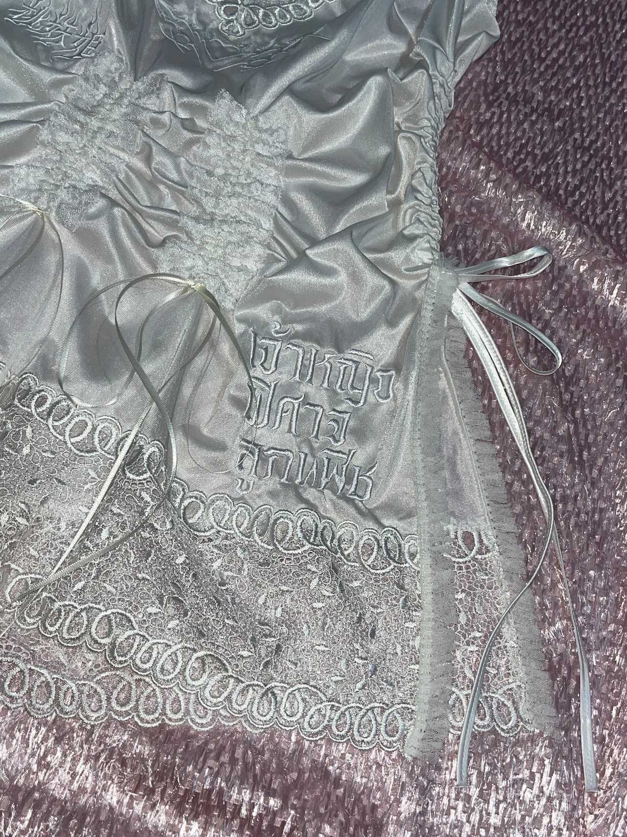 桃妖姫(日本語)・เจ้าหญิง ปีศาจ ลูกพีช(タイ語)のロゴ刺繍を施した一点ものリメイクアイテム。