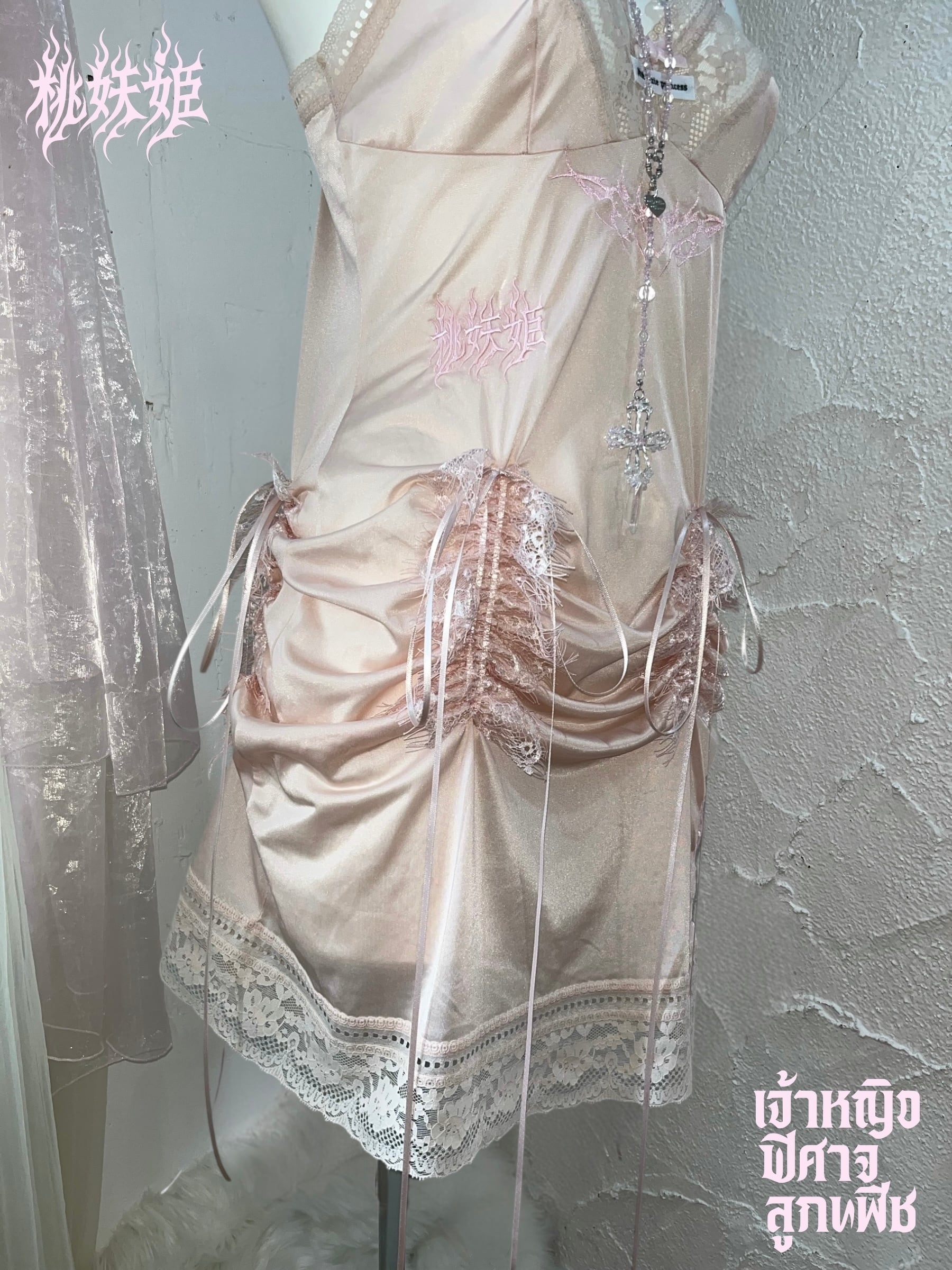 桃妖姫(日本語)・เจ้าหญิง ปีศาจ ลูกพีช(タイ語)のロゴ刺繍を施した一点ものリメイクアイテム。