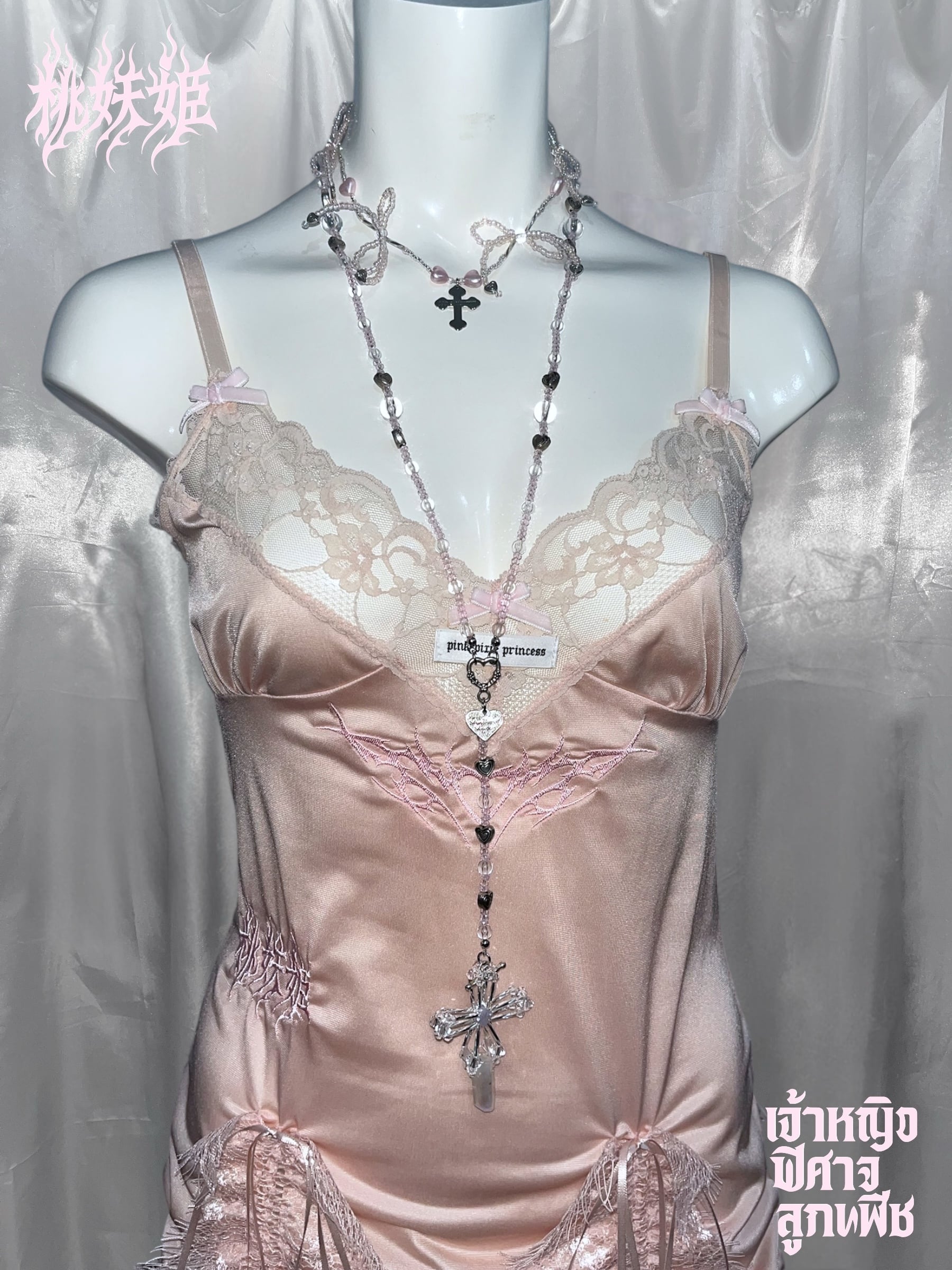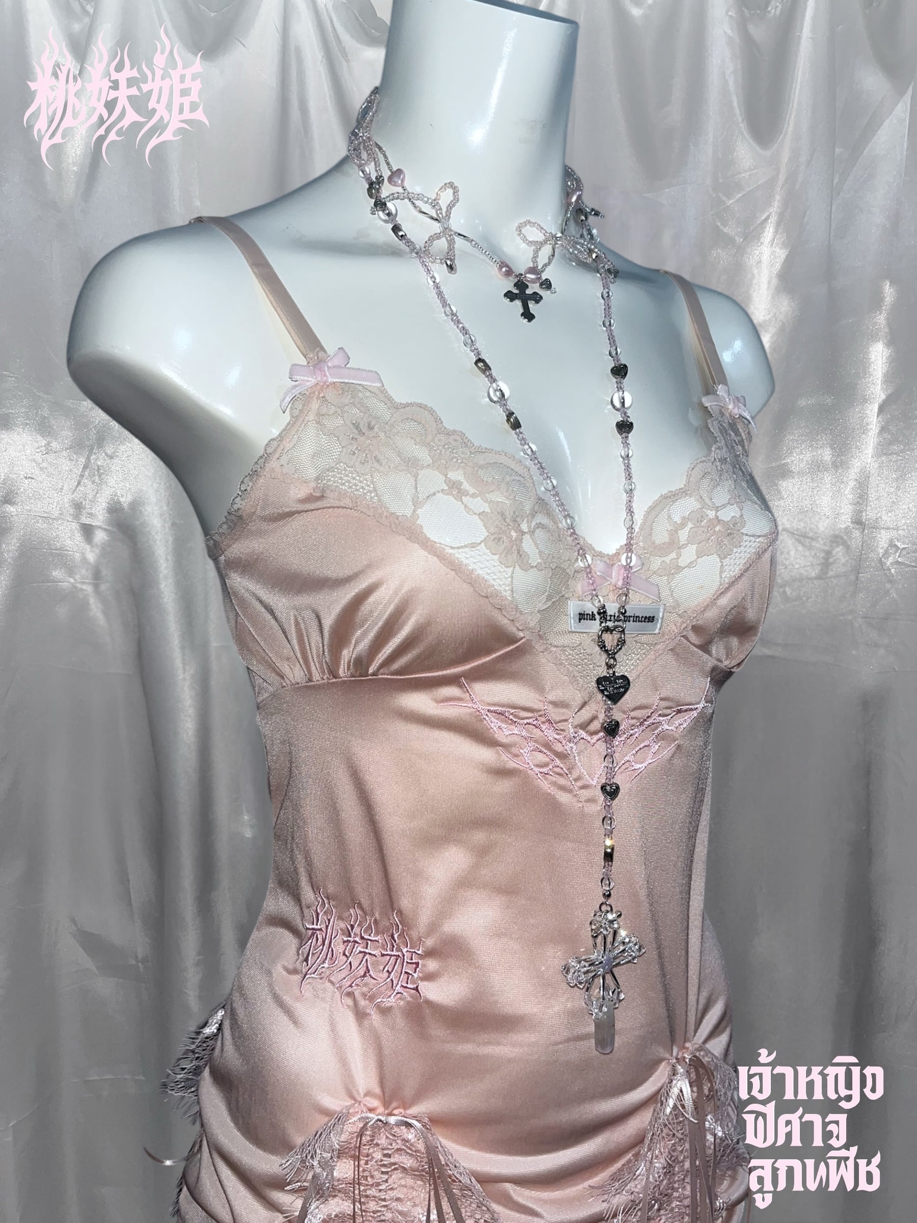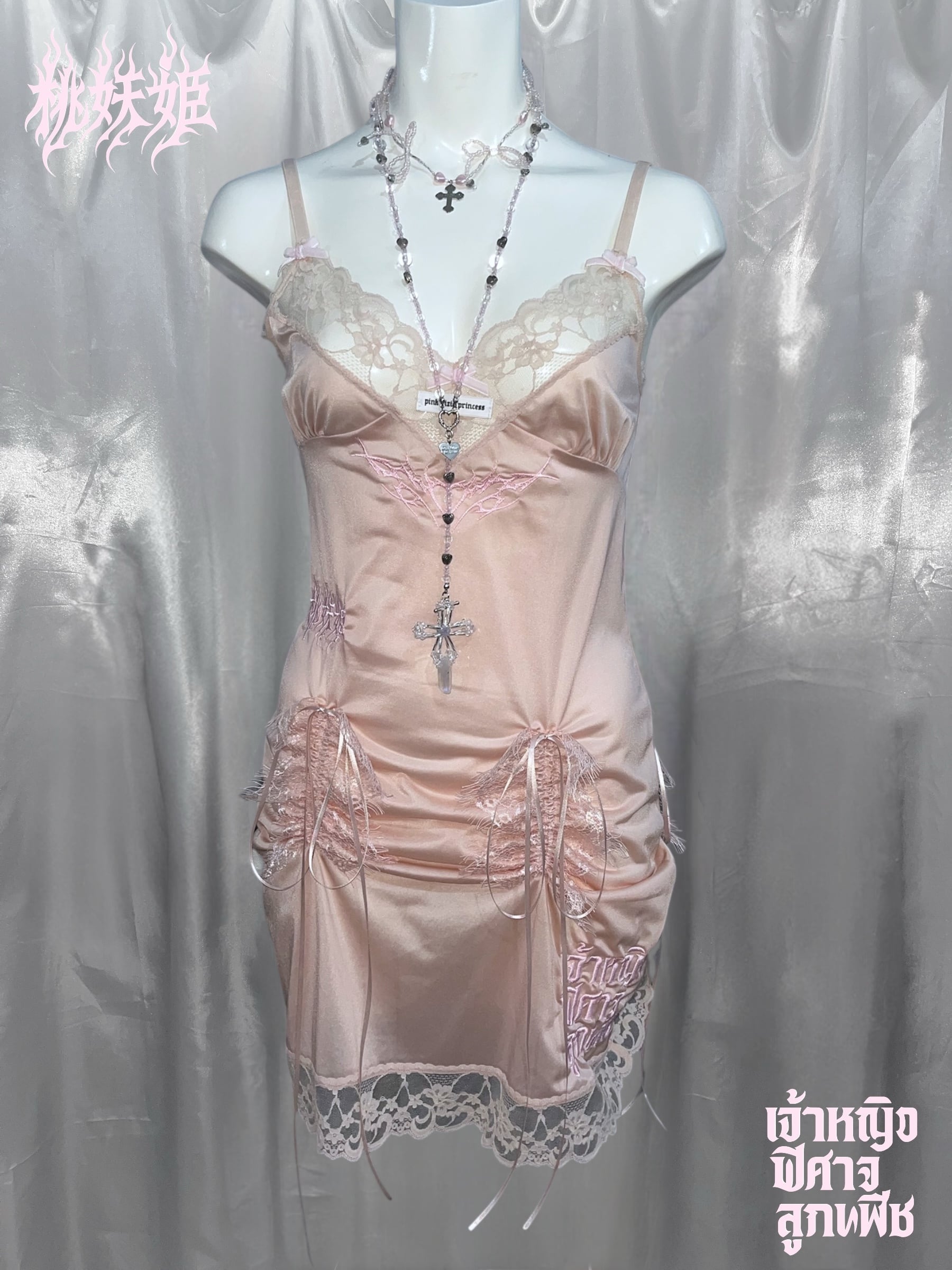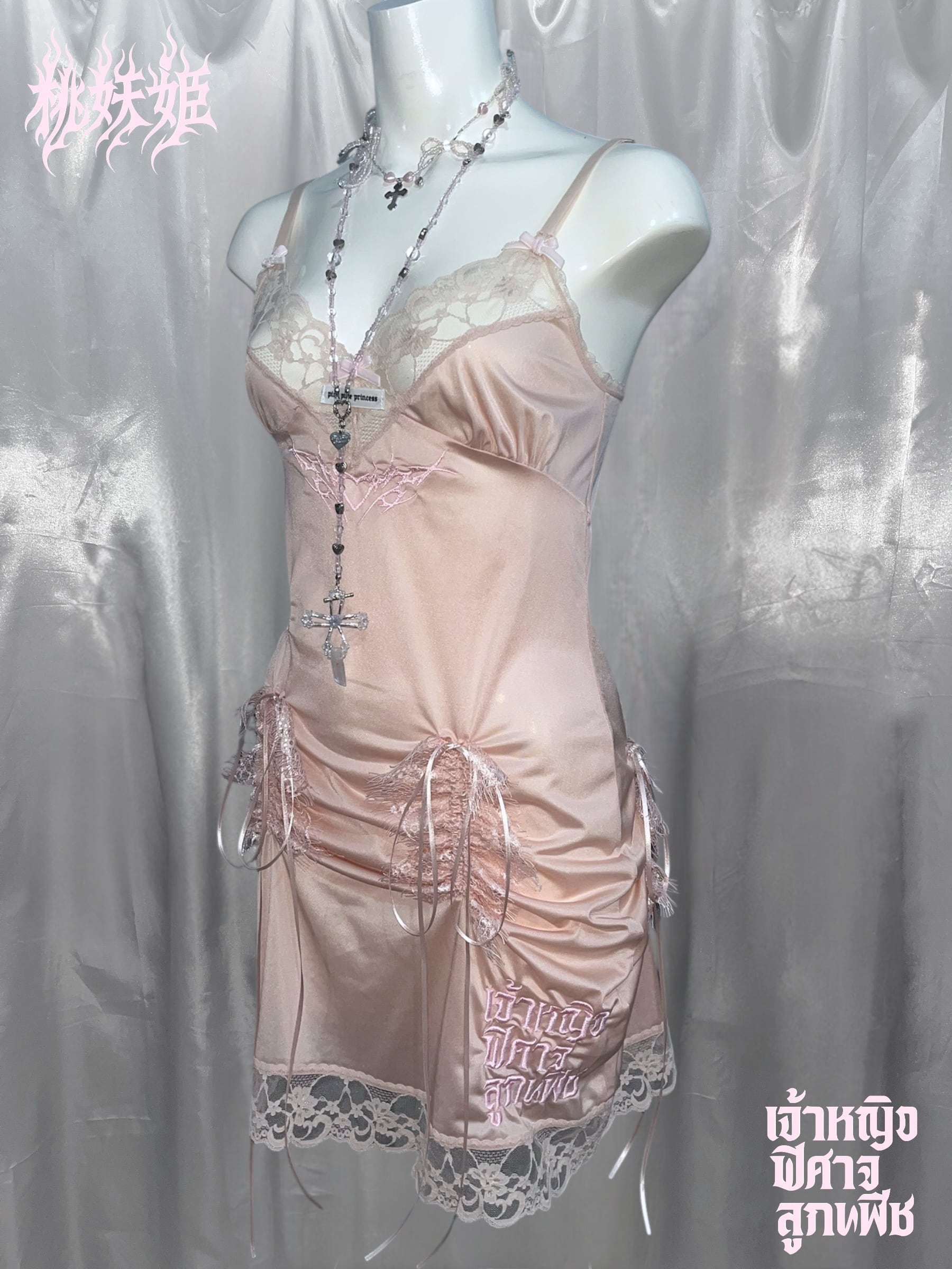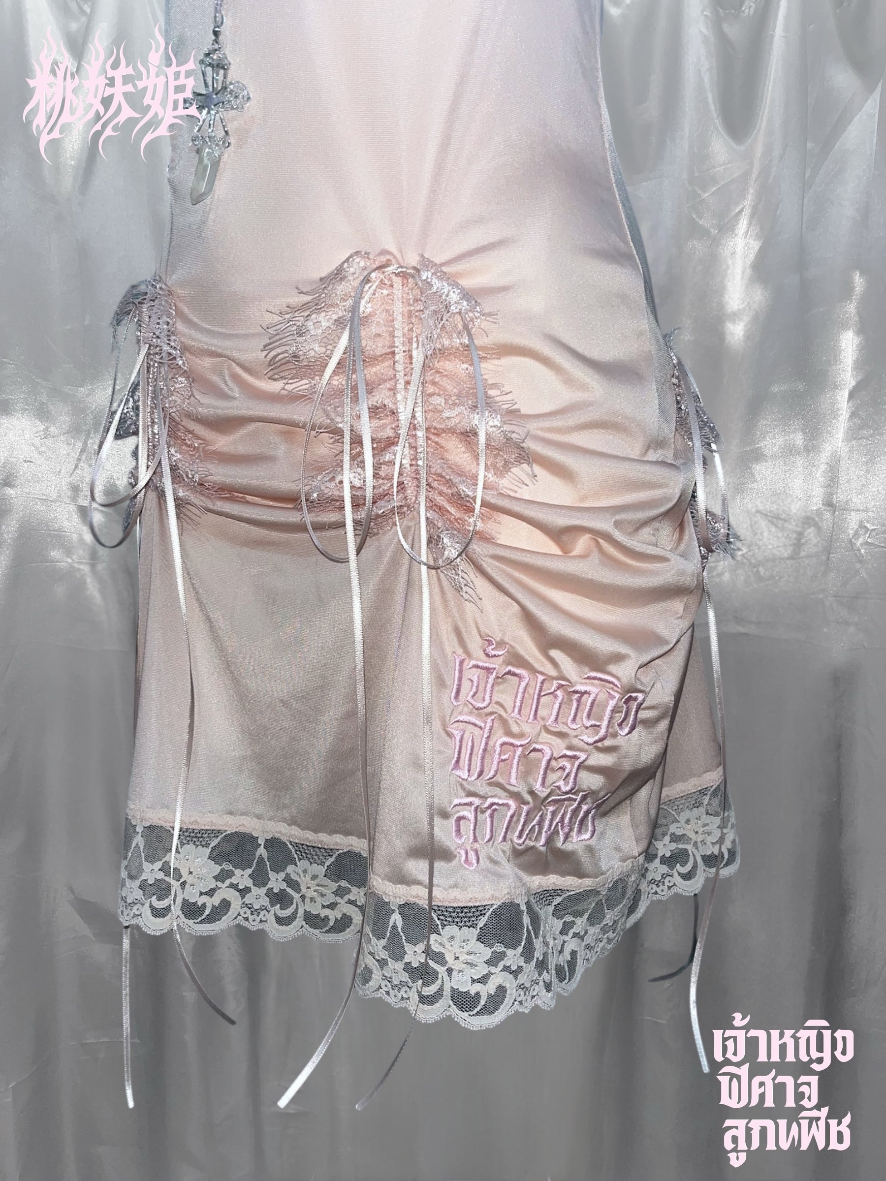 桃妖姫(日本語)・เจ้าหญิง ปีศาจ ลูกพีช(タイ語)のロゴ刺繍を施した一点ものリメイクアイテム。