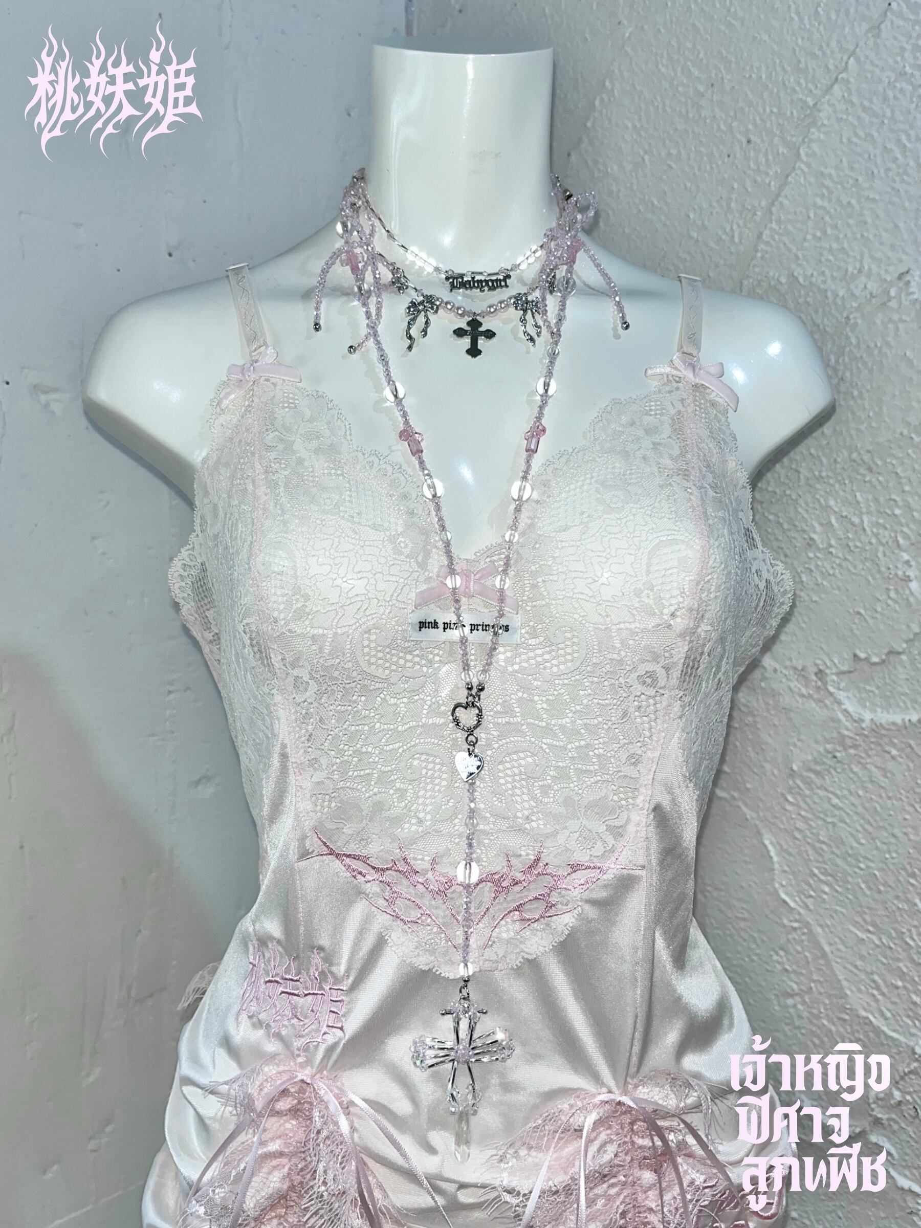 桃妖姫(日本語)・เจ้าหญิง ปีศาจ ลูกพีช(タイ語)のロゴ刺繍を施した一点ものリメイクアイテム。