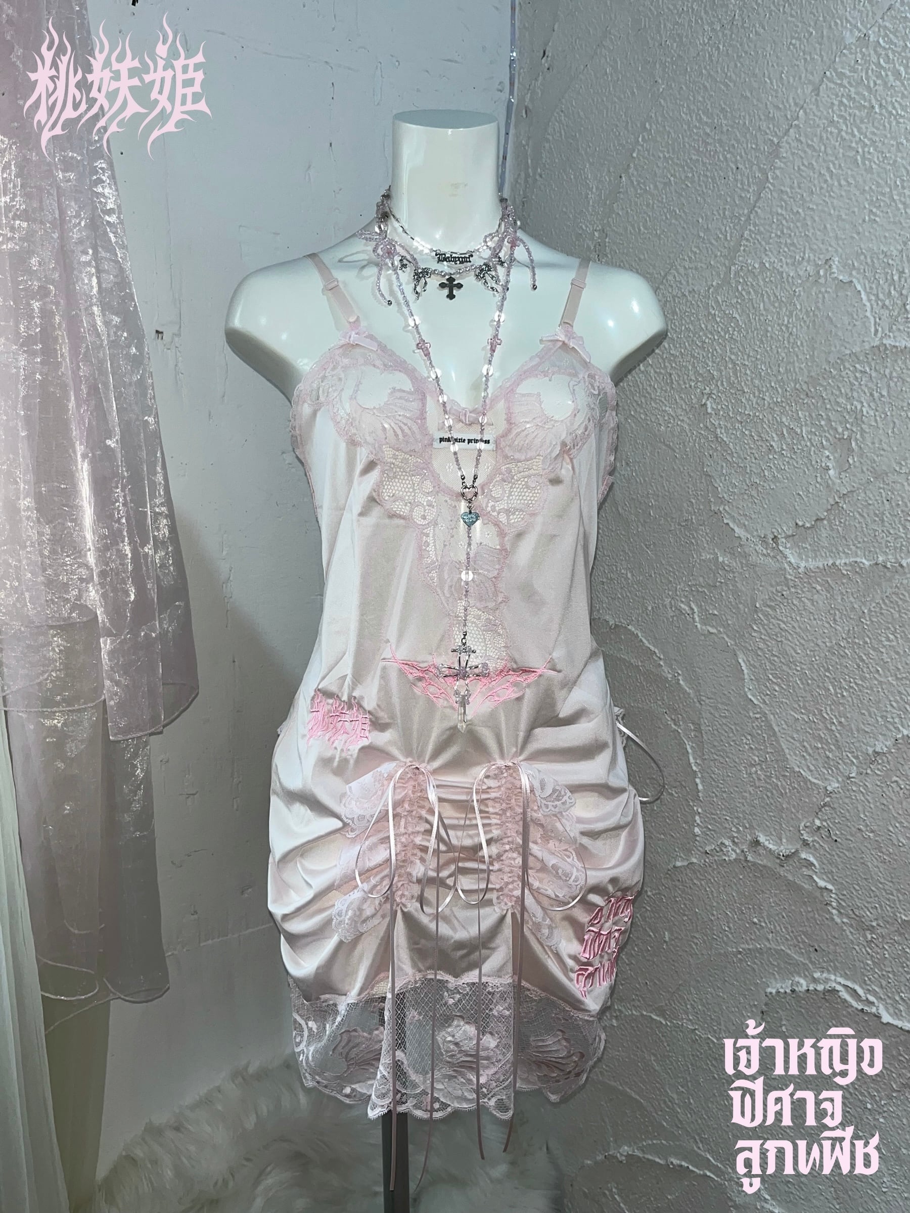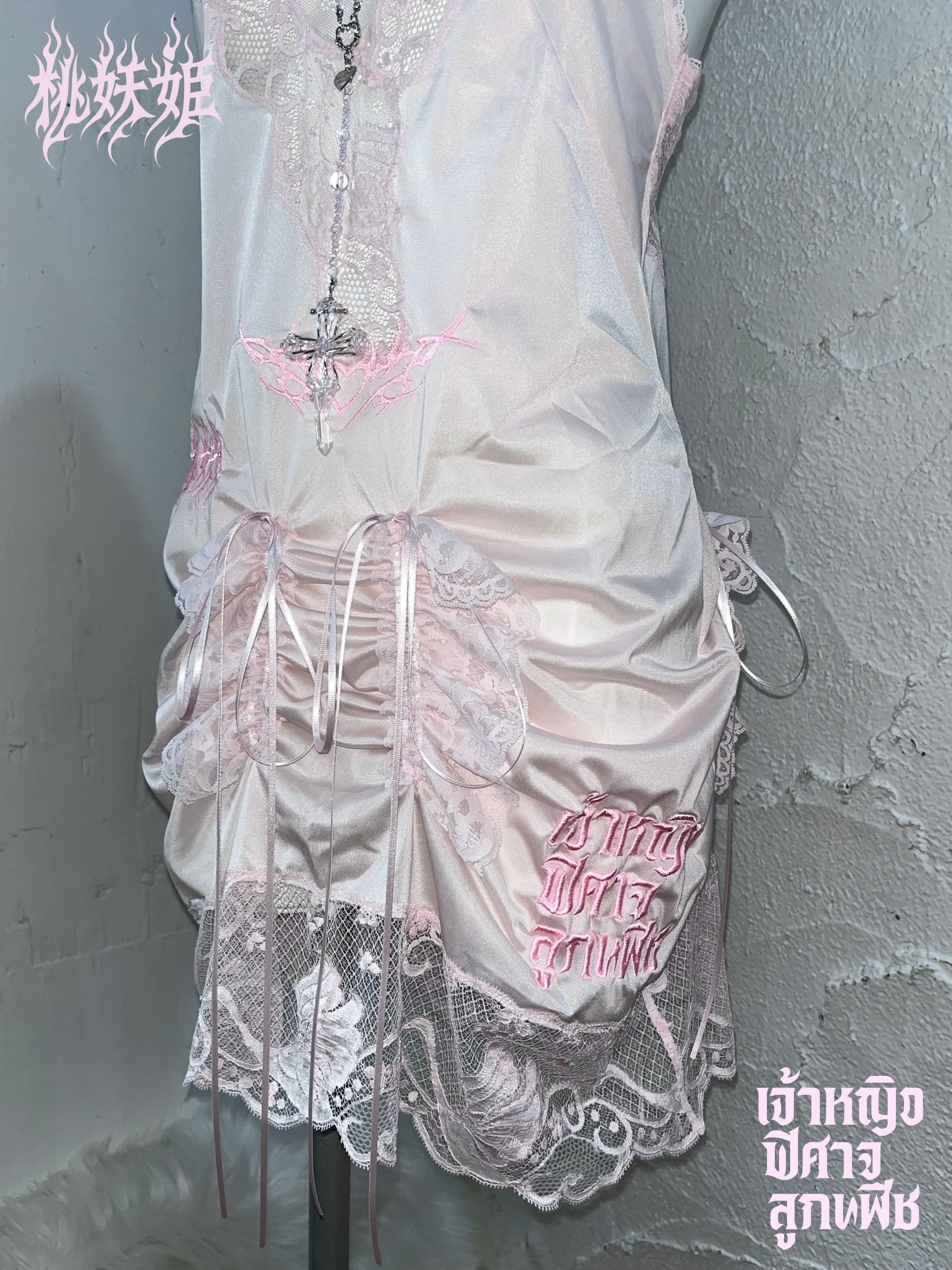 桃妖姫(日本語)・เจ้าหญิง ปีศาจ ลูกพีช(タイ語)のロゴ刺繍を施した一点ものリメイクアイテム。
