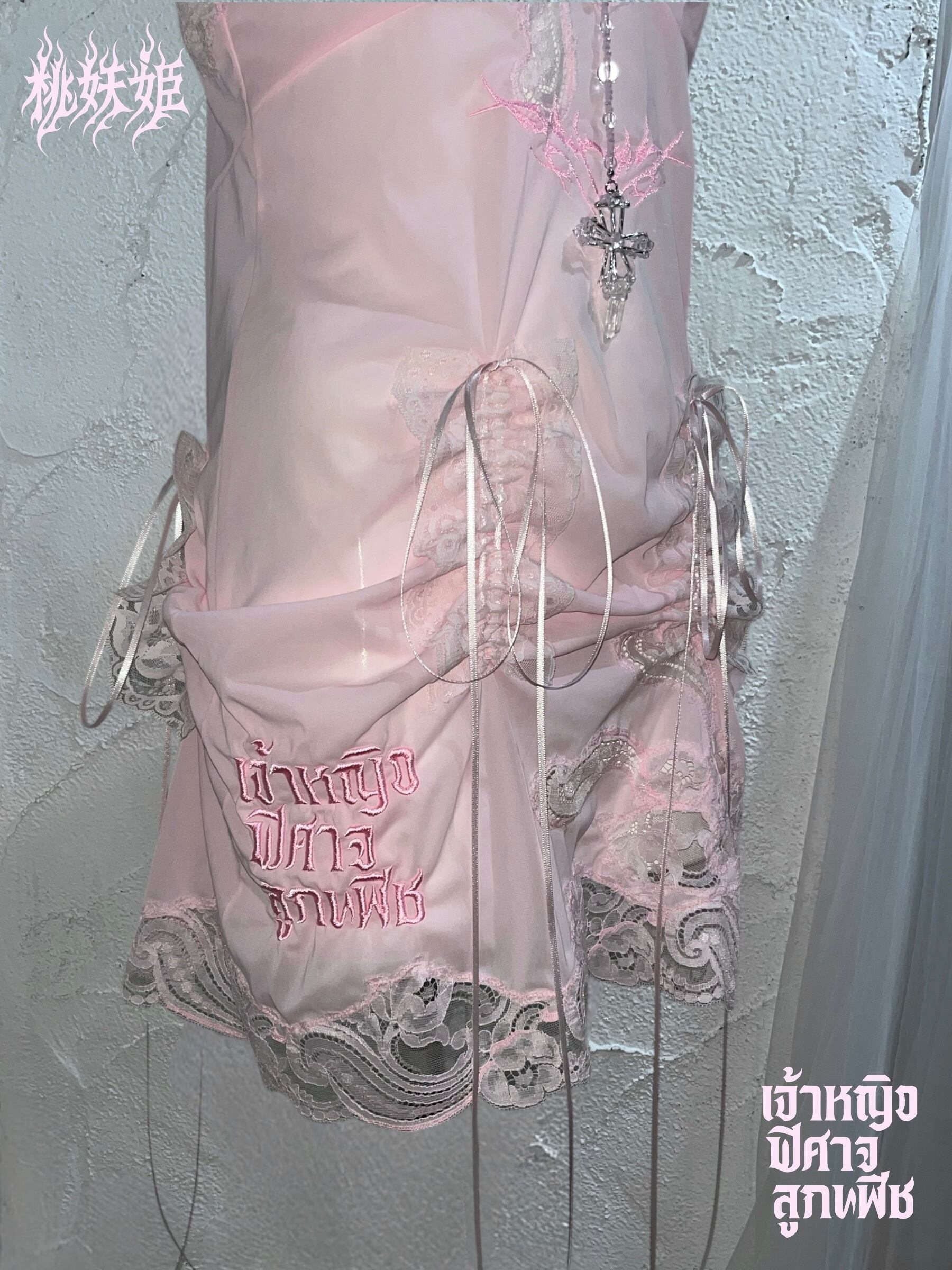 桃妖姫(日本語)・เจ้าหญิง ปีศาจ ลูกพีช(タイ語)のロゴ刺繍を施した一点ものリメイクアイテム。