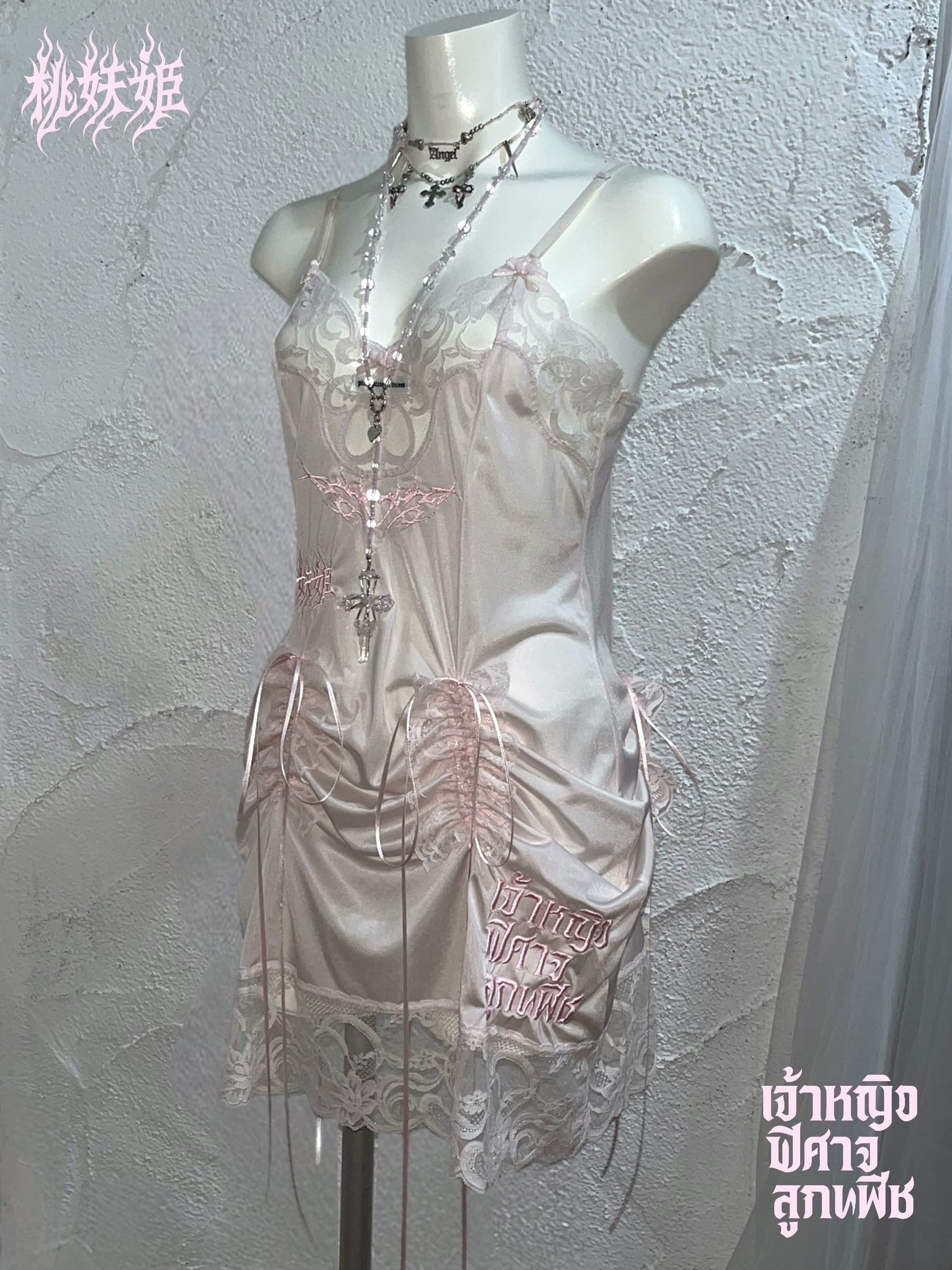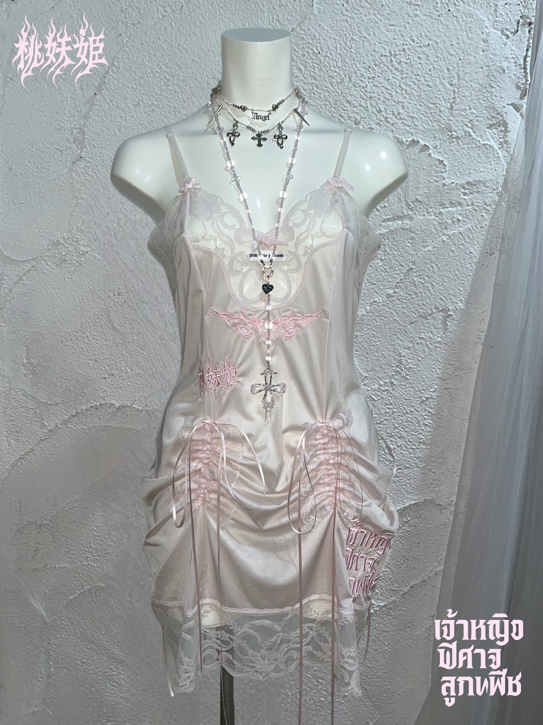 桃妖姫(日本語)・เจ้าหญิง ปีศาจ ลูกพีช(タイ語)のロゴ刺繍を施した一点ものリメイクアイテム。