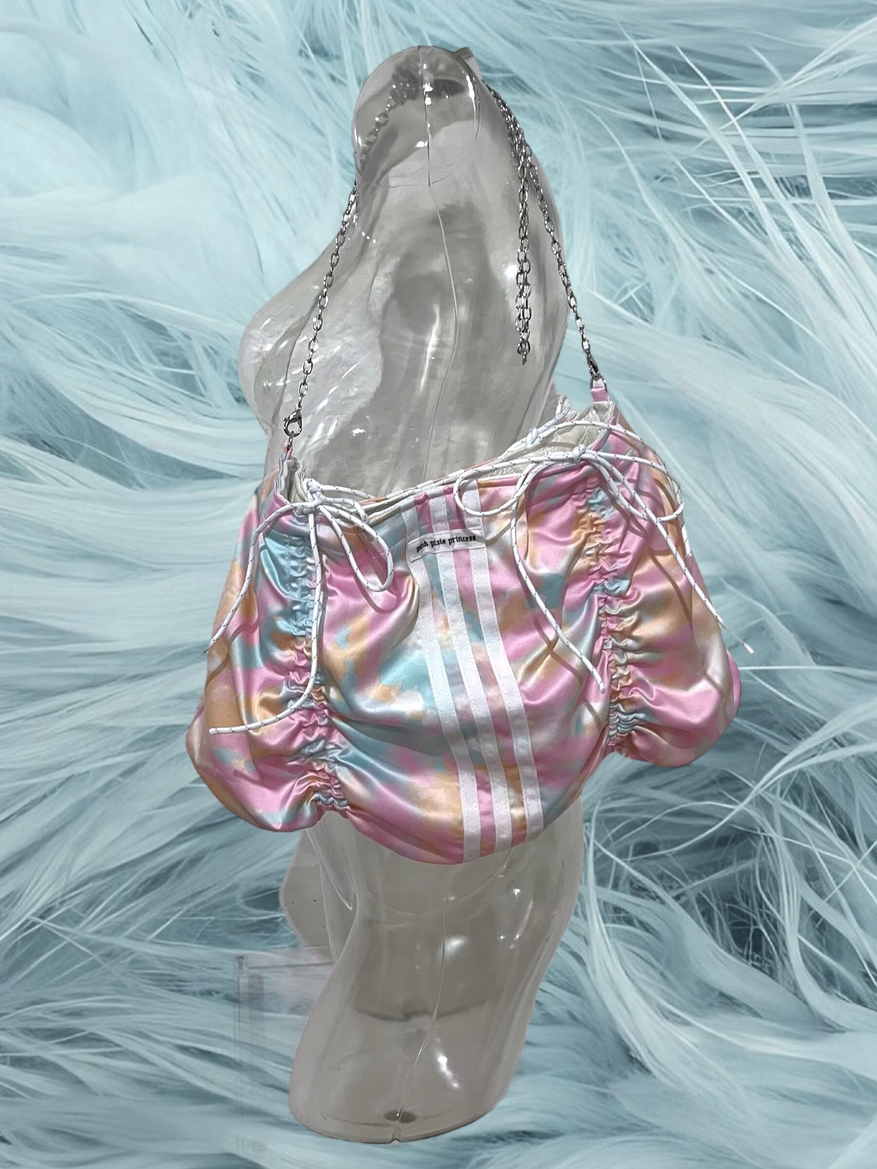 こちらはトラックスーツを解体し、一部生地を再利用して制作したギャザーリボンハンドバッグです。