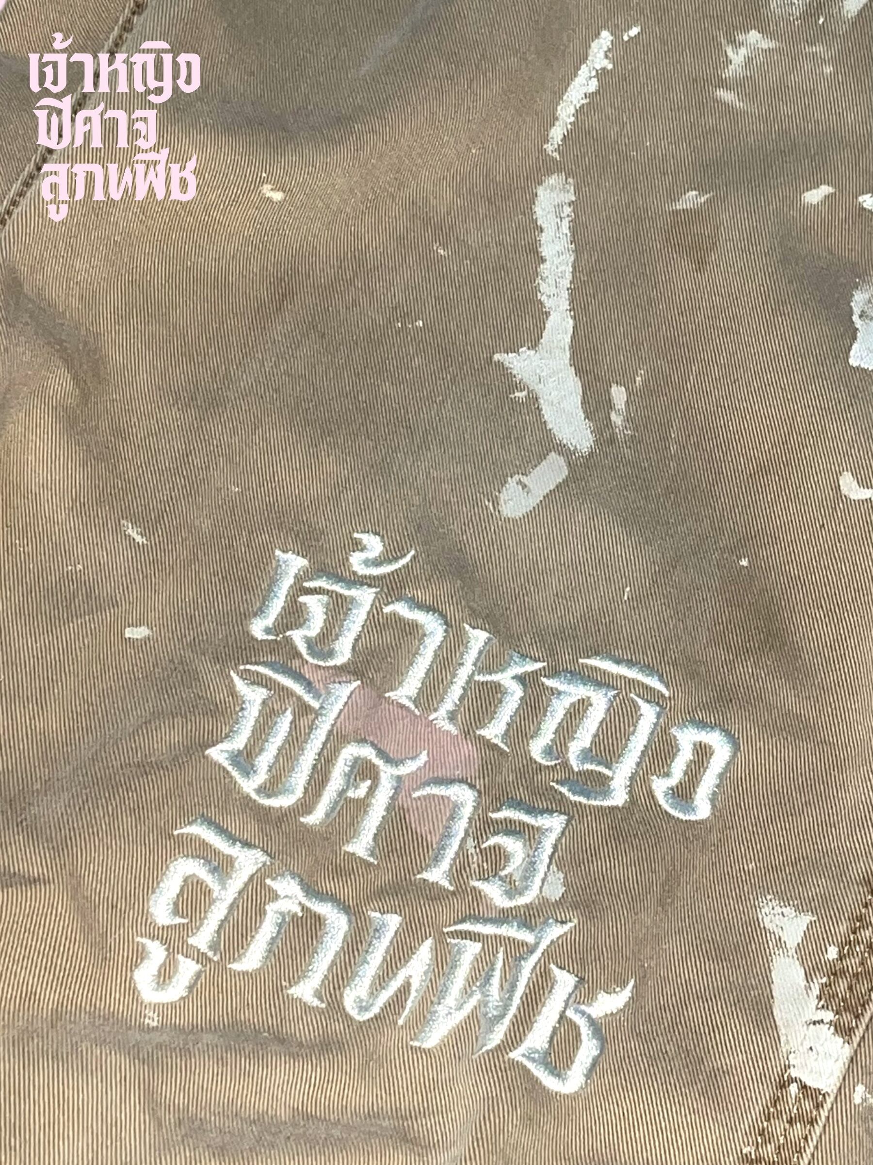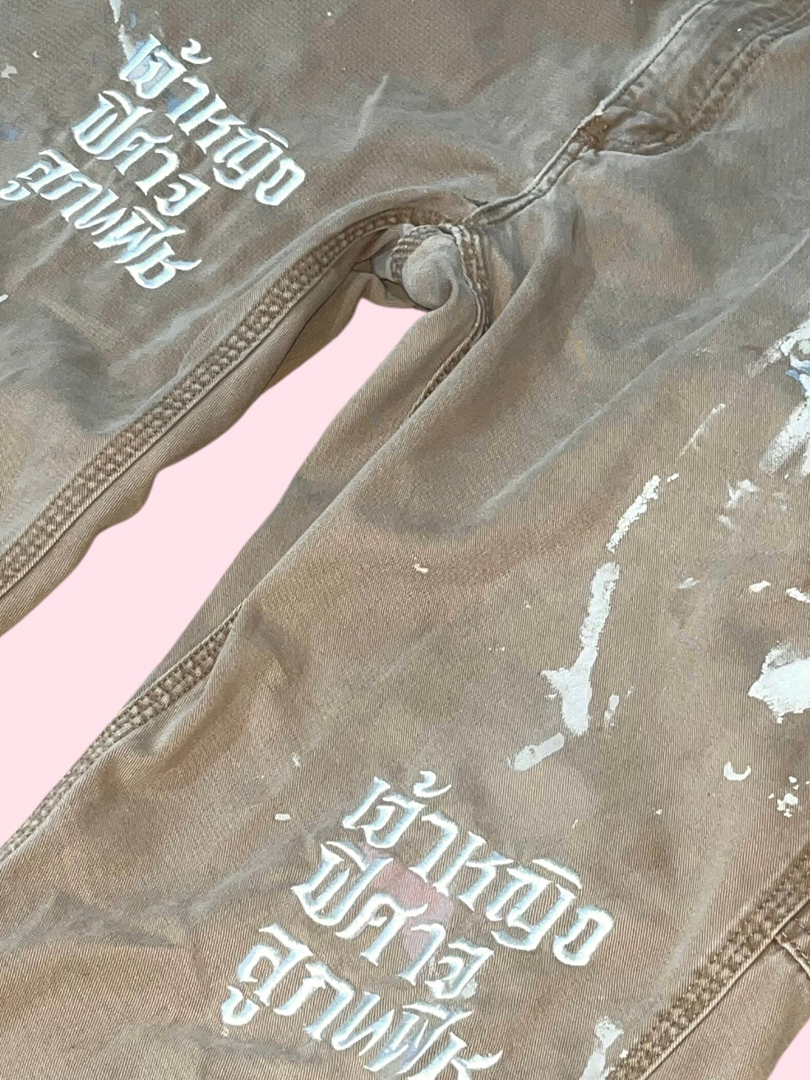 Carharttのワークパンツをベースに、เจ้าหญิงปีศาจลูกพีช(桃妖姫) タイ語ロゴを刺繍した 1点物リメイクシリーズ です。