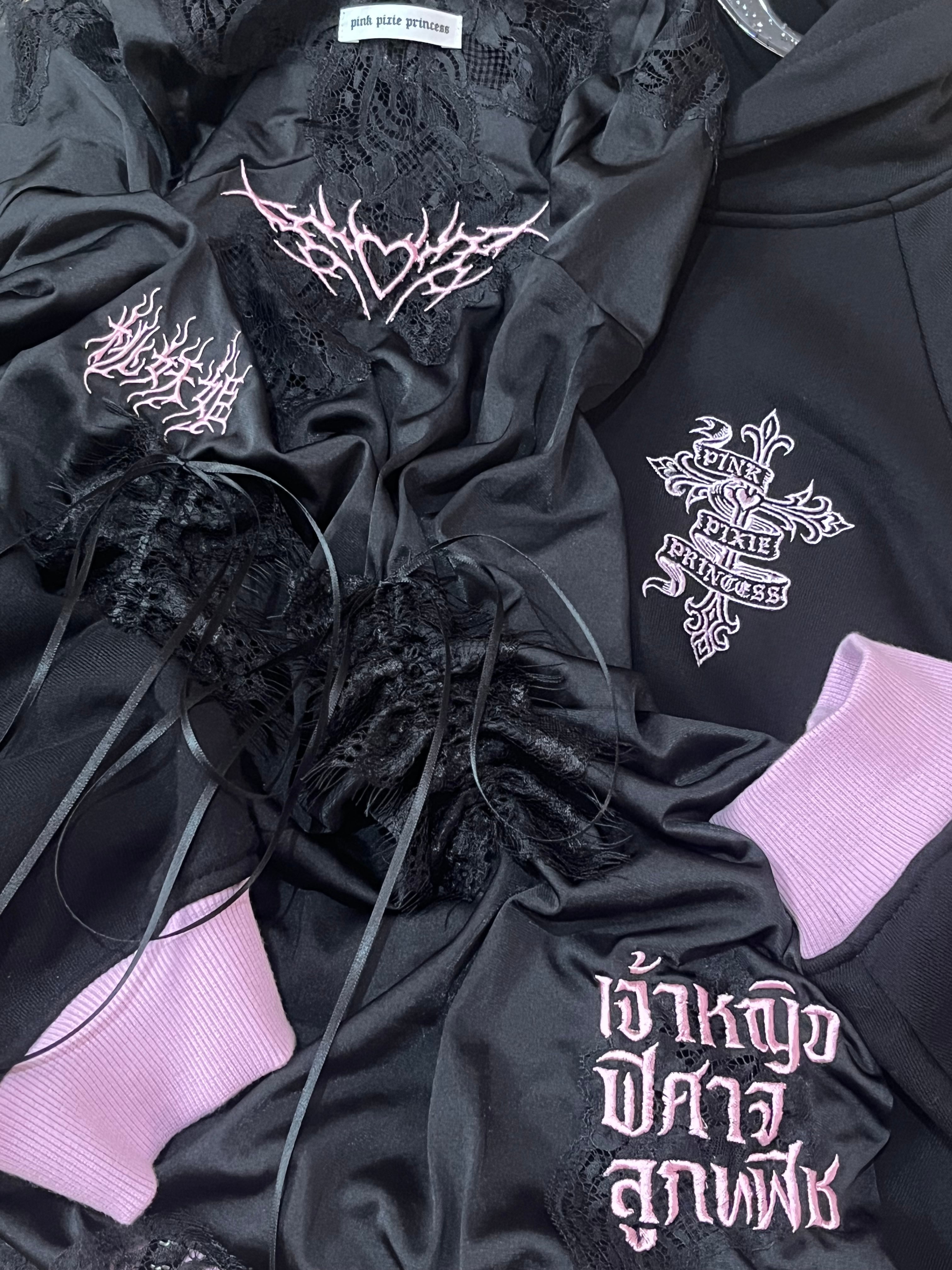 PPP Ribbon Emblem Cross Embroidered Double Zip Hoodie / Black