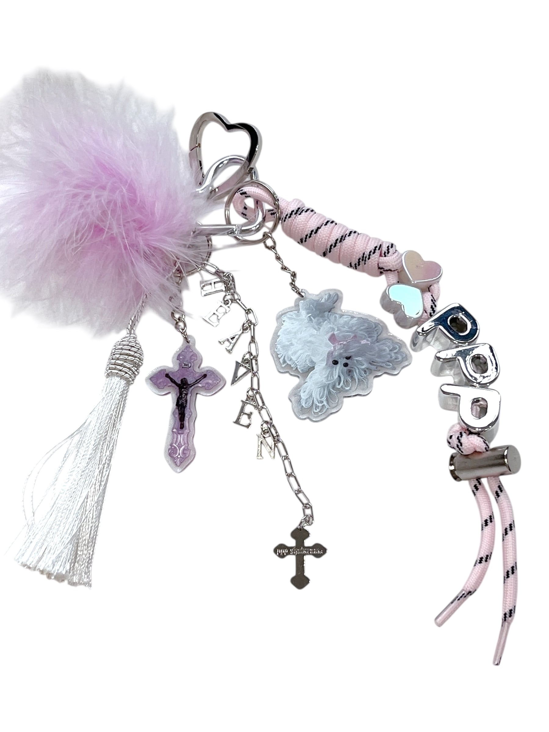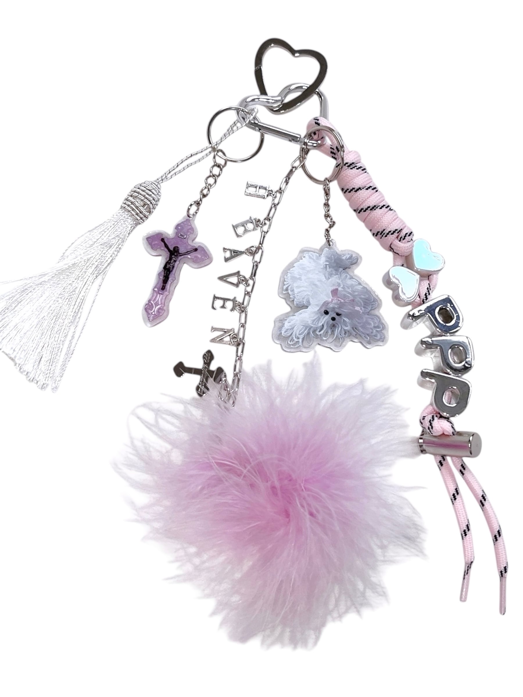 pppオリジナルチャームやアルファベットハートパーツ、ふわふわファー(取り外し可)やタッセルなどを組み合わせたカスタムキーリングです。
