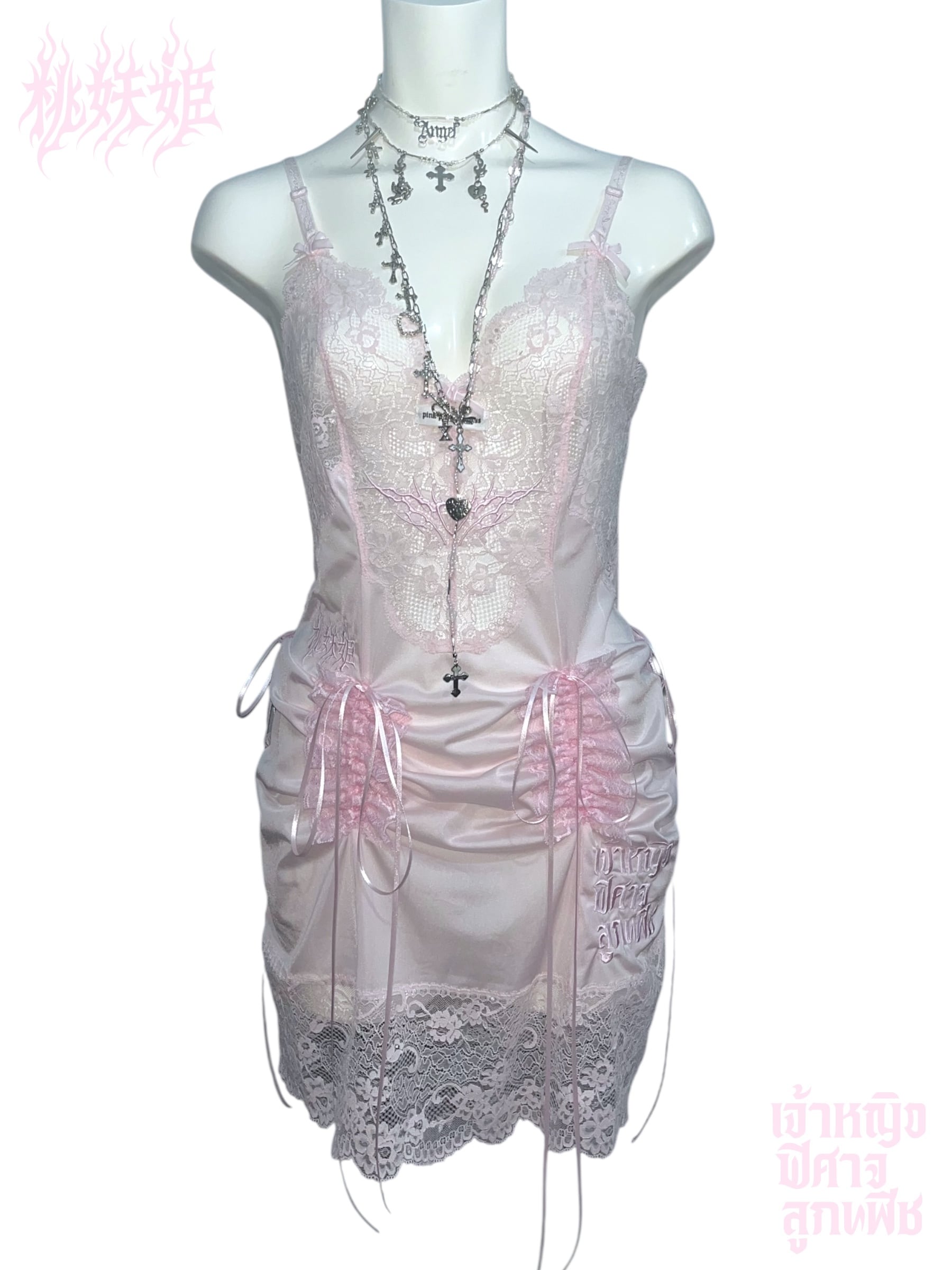桃妖姫(日本語)・เจ้าหญิง ปีศาจ ลูกพีช(タイ語)のロゴ刺繍を施した一点ものリメイクアイテム。