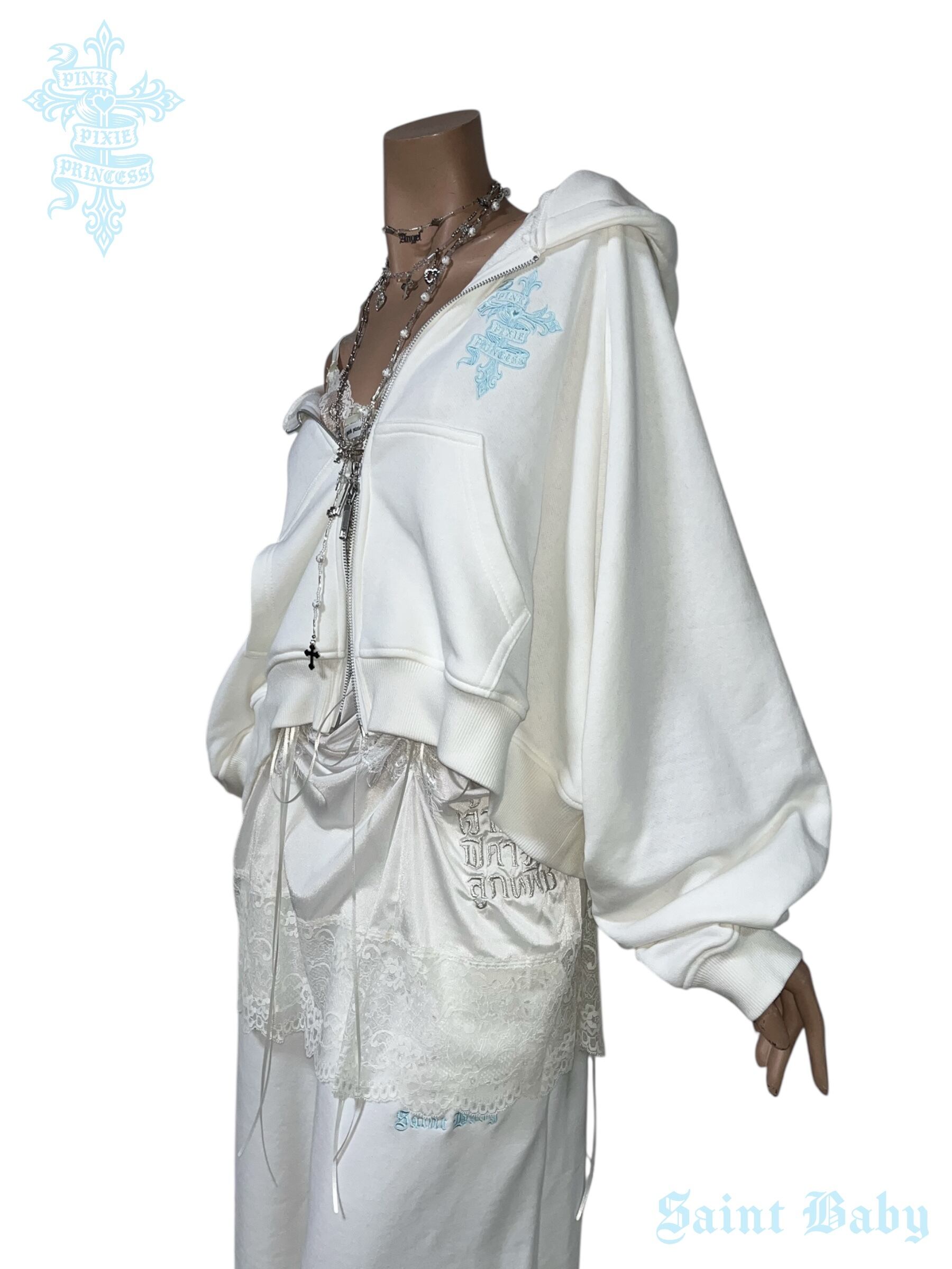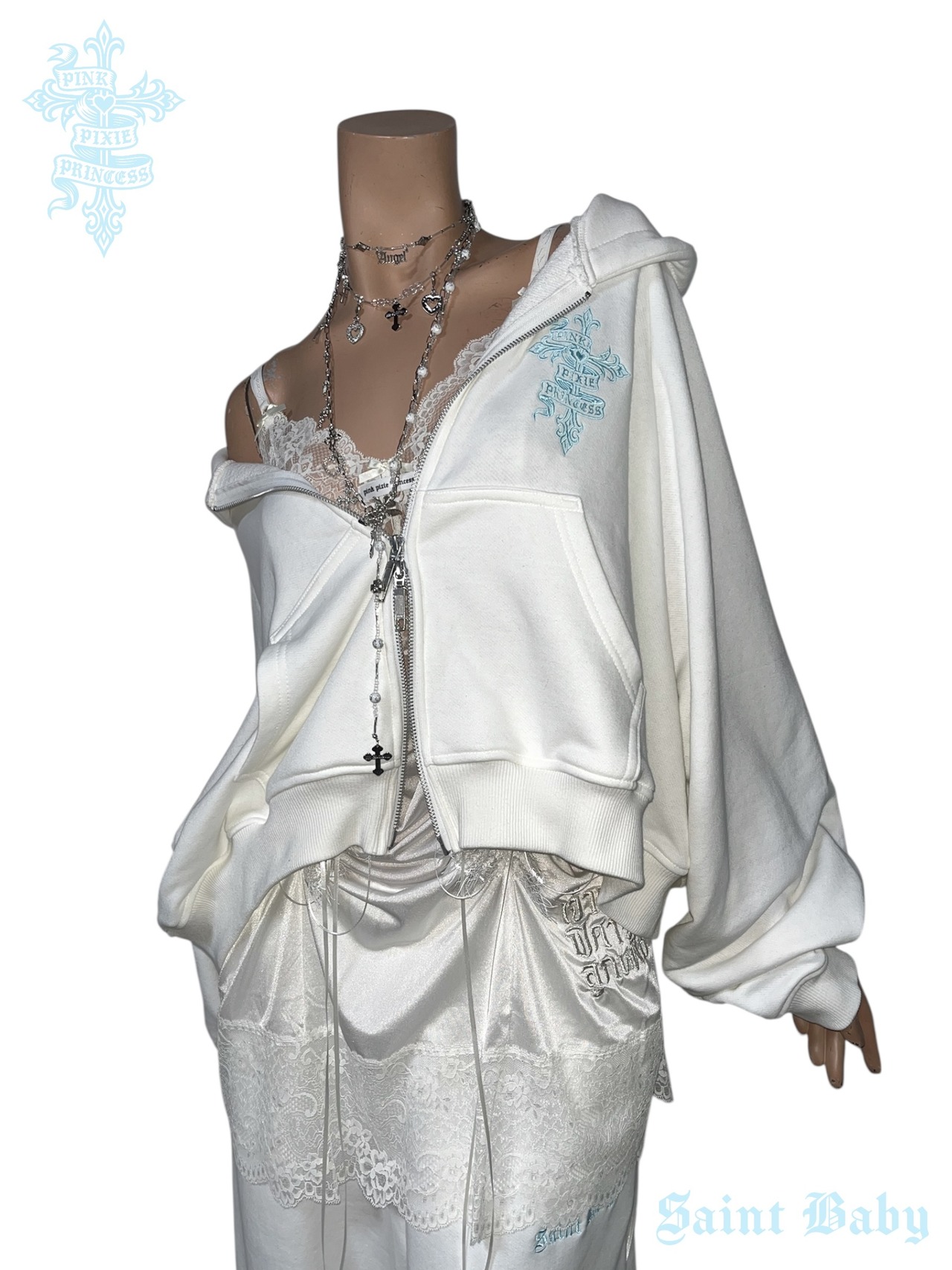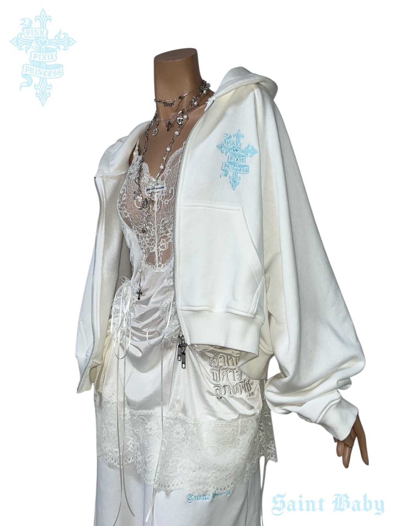 PPP Ribbon Emblem Cross Embroidered Double Zip Hoodie / off-white × baby blue