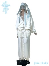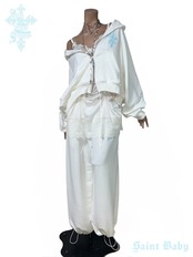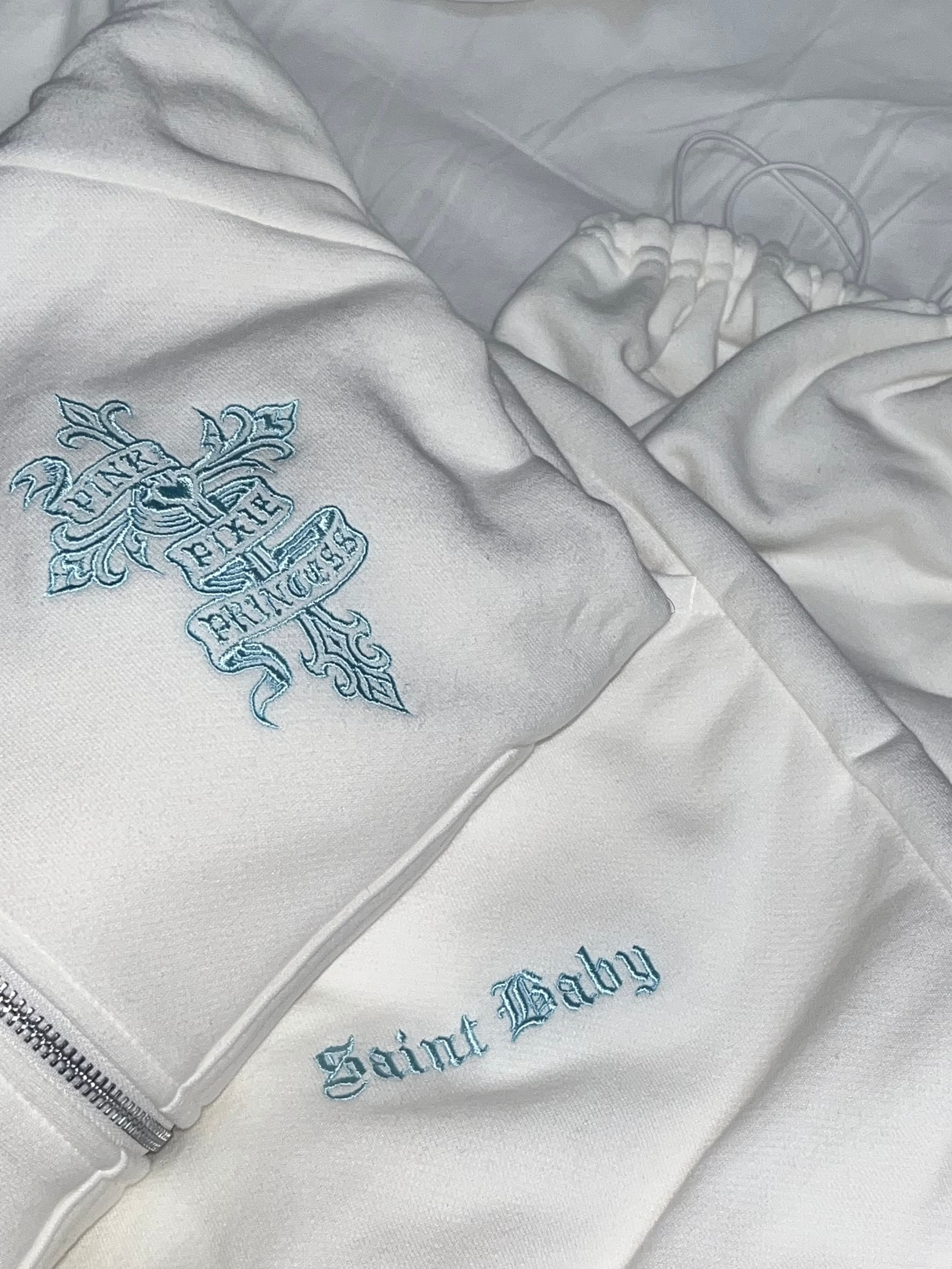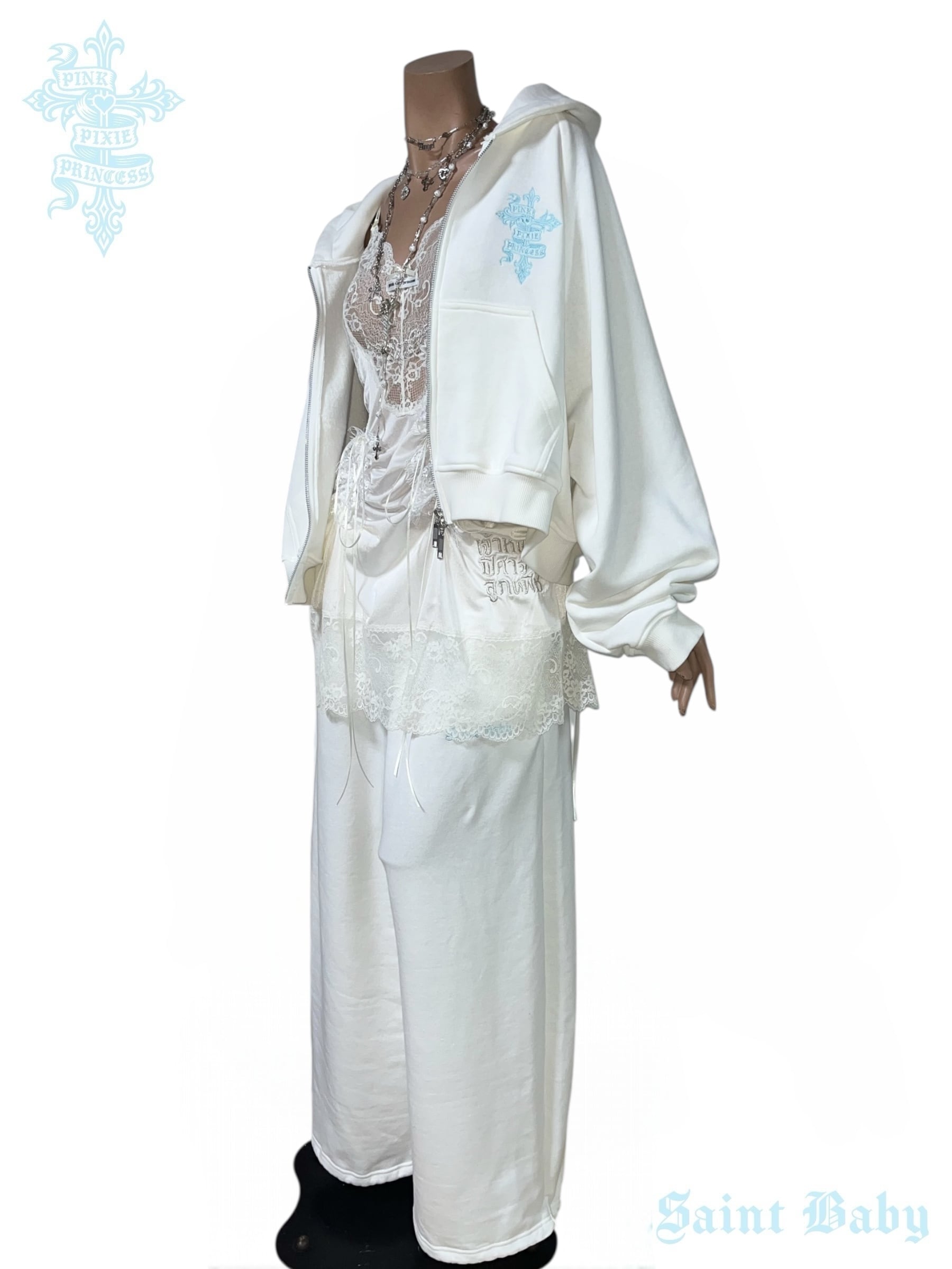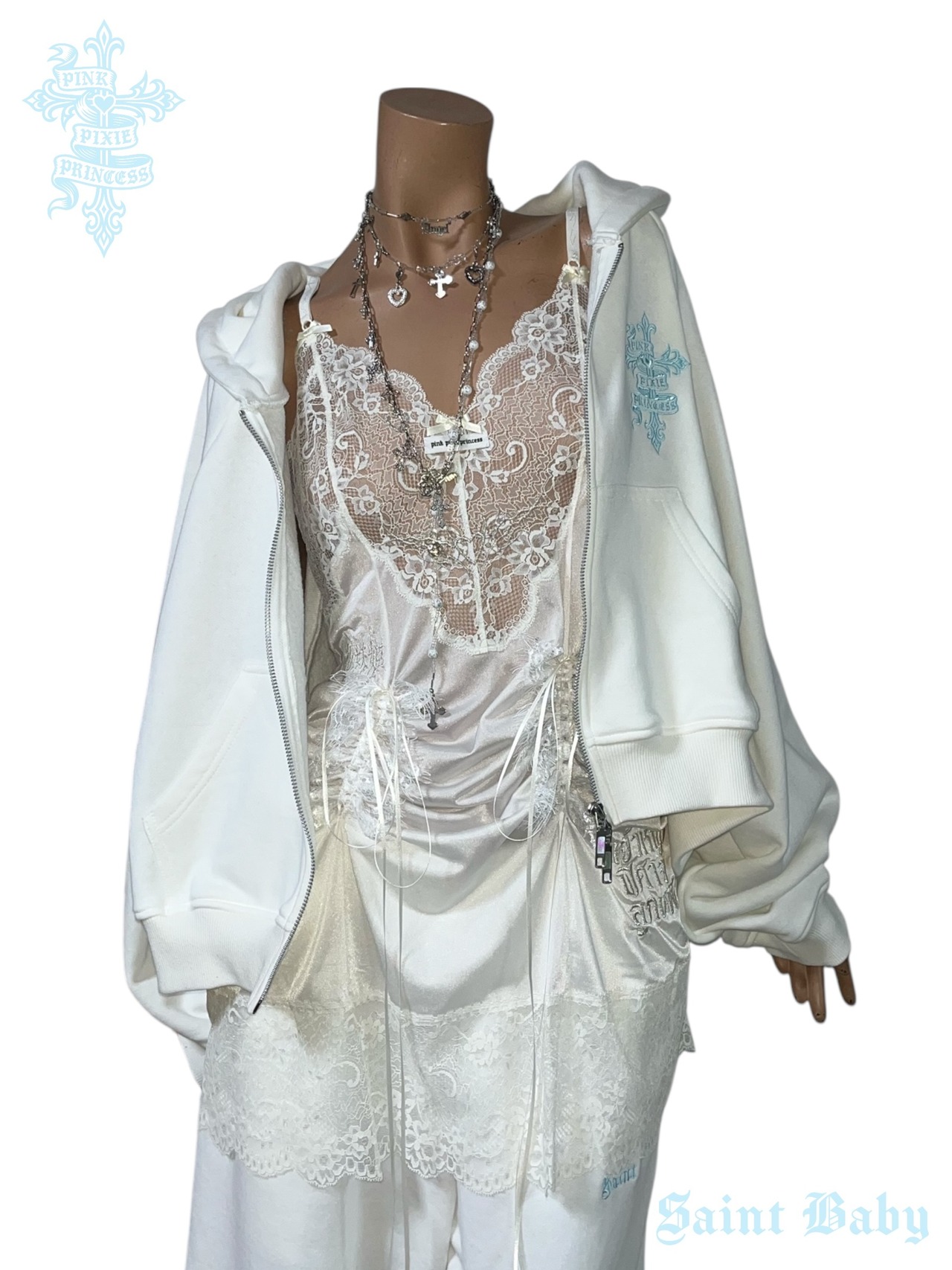 PPP Ribbon Emblem Cross Embroidered Double Zip Hoodie / off-white × baby blue