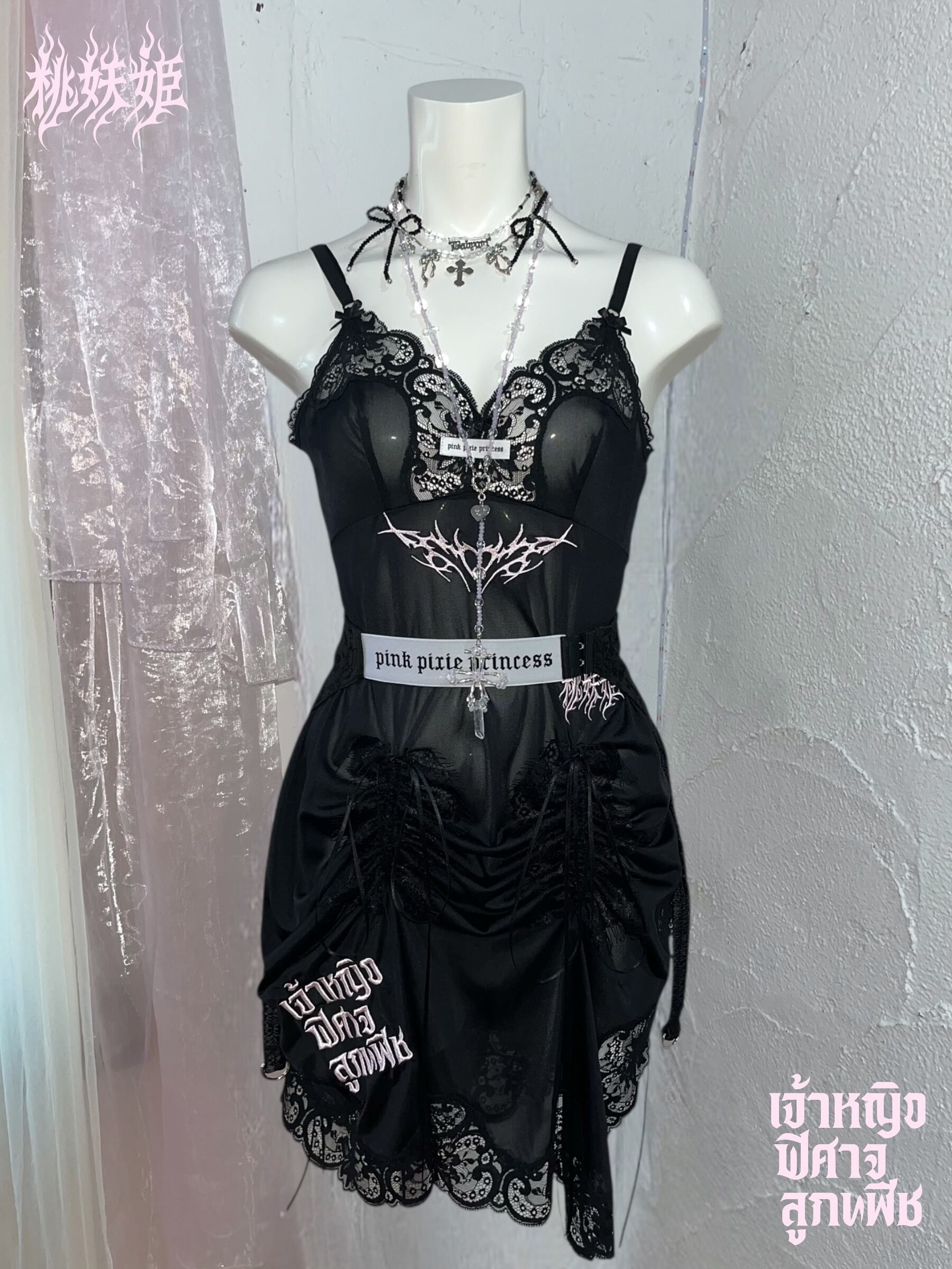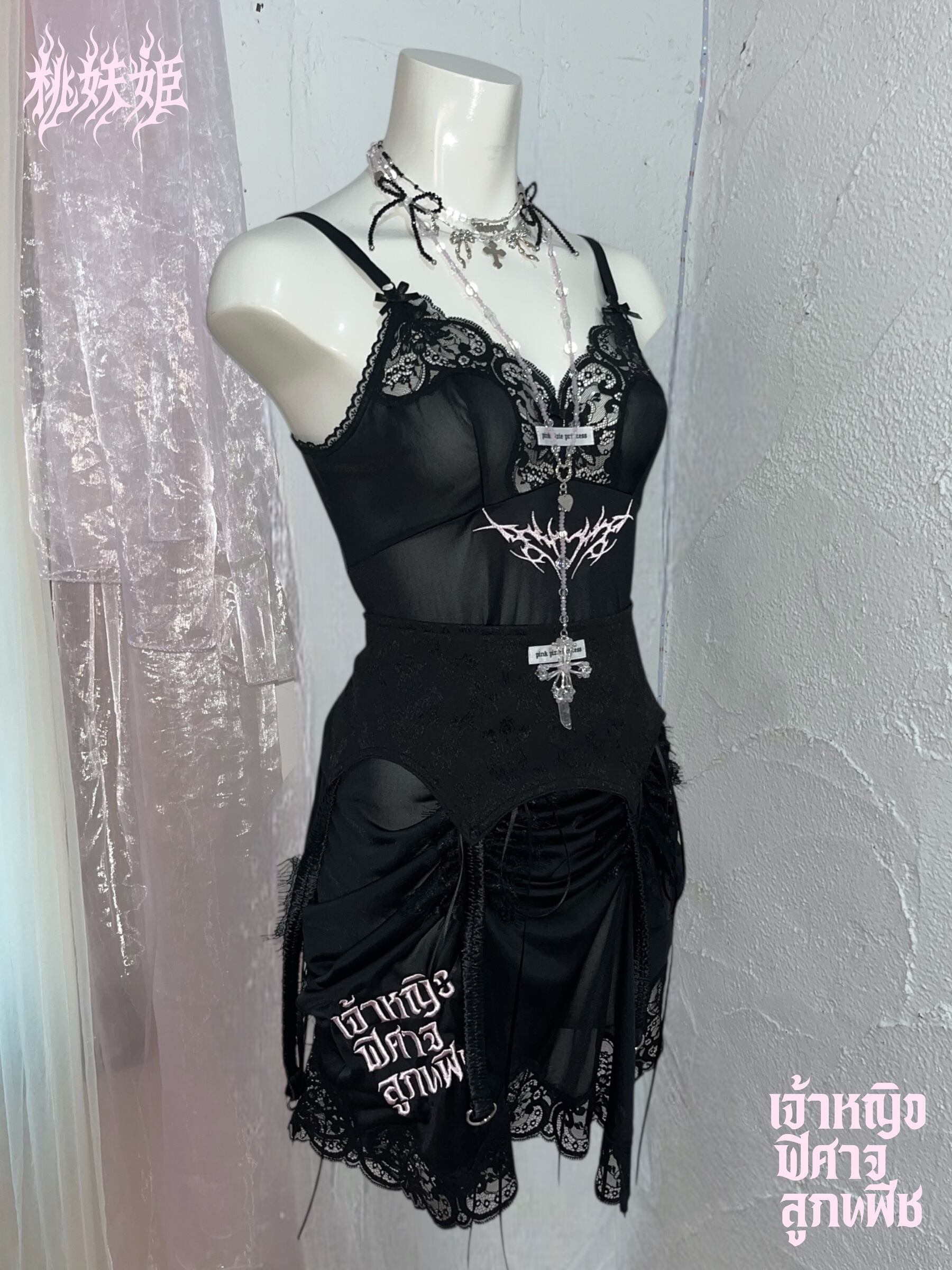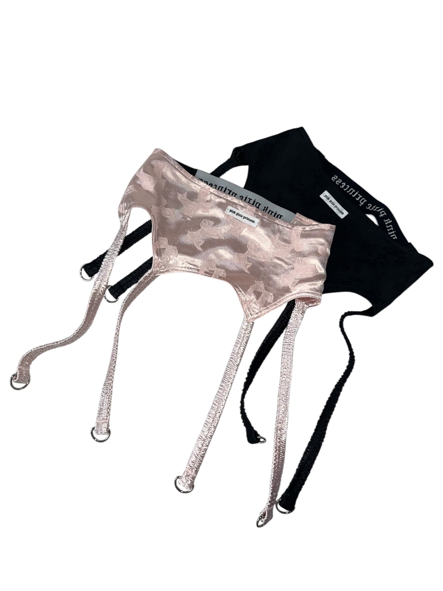 コットンジャガード地にシルキーなサテンコードがゆらゆら揺れるガーターベルトデザインのボディアクセサリー。